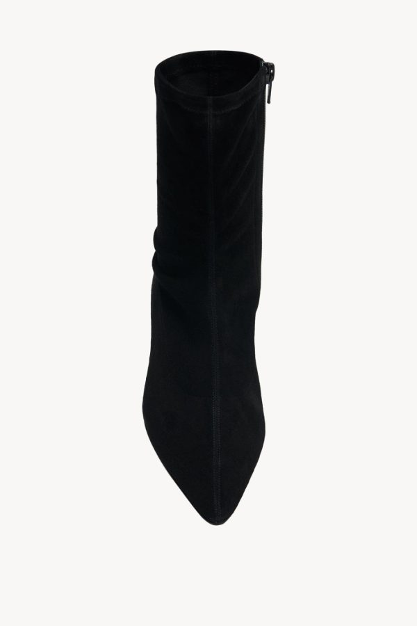 Ankle boot in soft suede with pointed toe, side zipper closure, and leather sole.