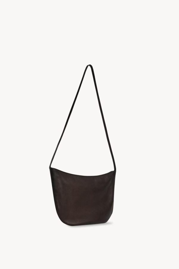 Gently curved shoulder bag in smooth nappa leather with slim strap, embossed logo on side, and zipper closure.