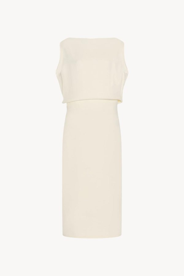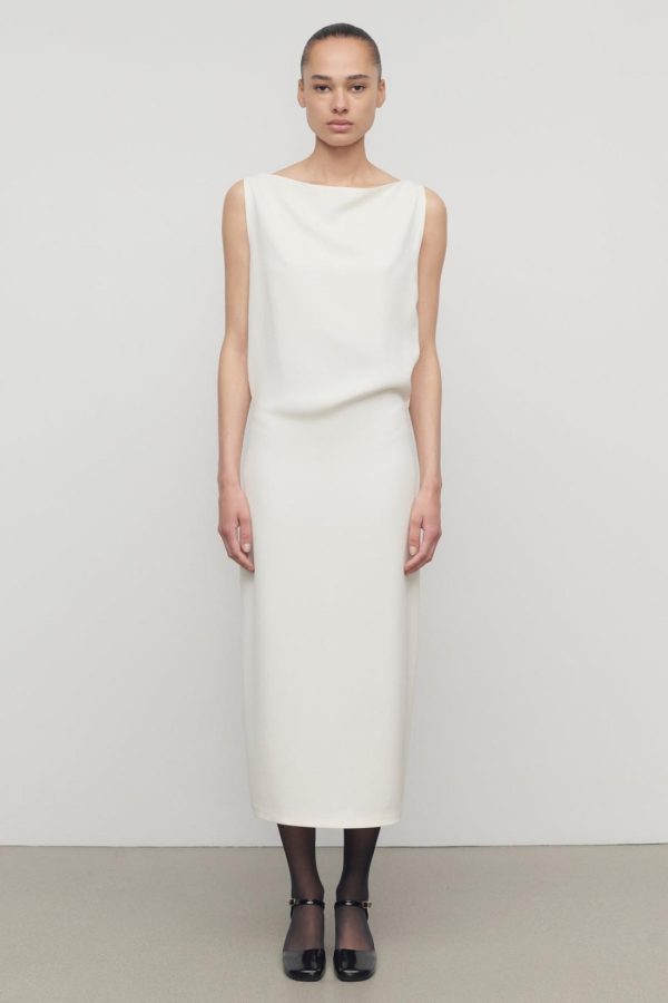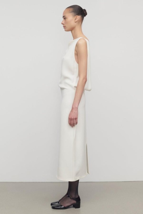 Calf-length column dress in smooth heavyweight silk with open back slit, center back hem vent, and concealed back zip closure with hook & eye at neckline.