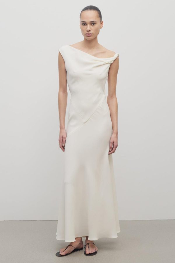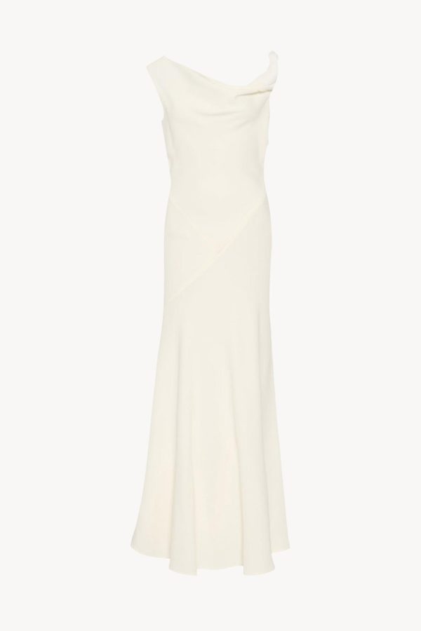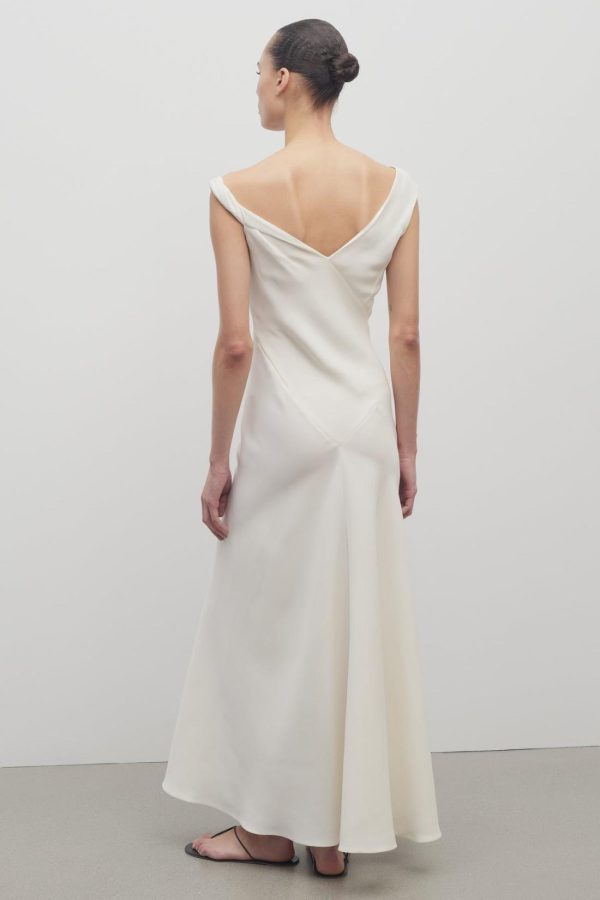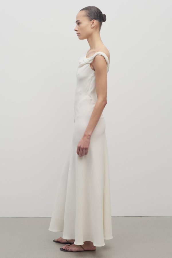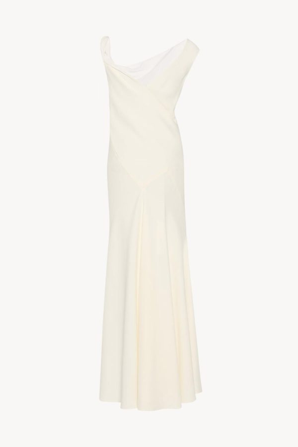 Ankle-length evening dress in fluid silk crepe with asymmetrical neckline, paneled construction, and flared fit.