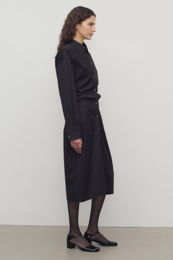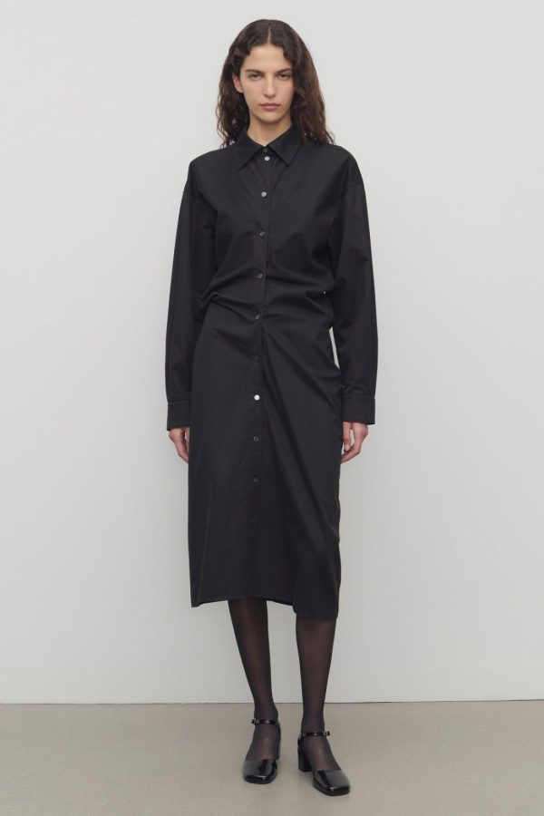 Calf-length shirtdress in cotton and cashmere gabardine with fitted silhouette, slight shirring at waist, and exposed front button placket.