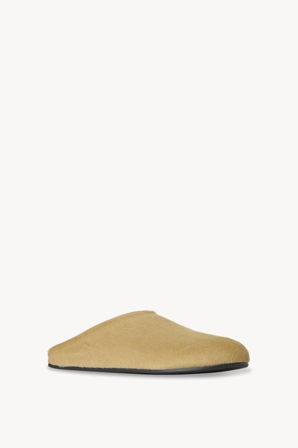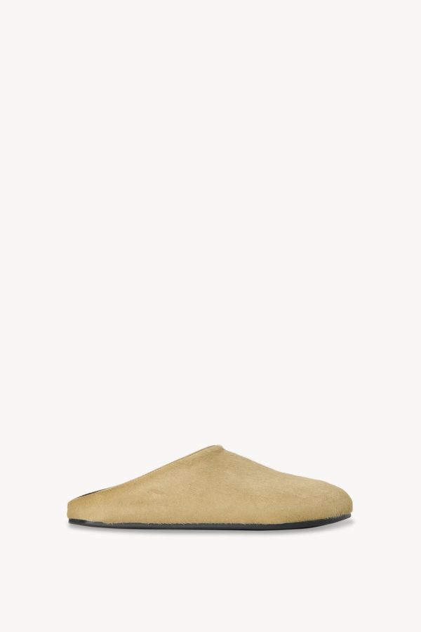 Relaxed slip-on shoe in textured pony hair leather with round toe, contoured footbed, and rubber sole.