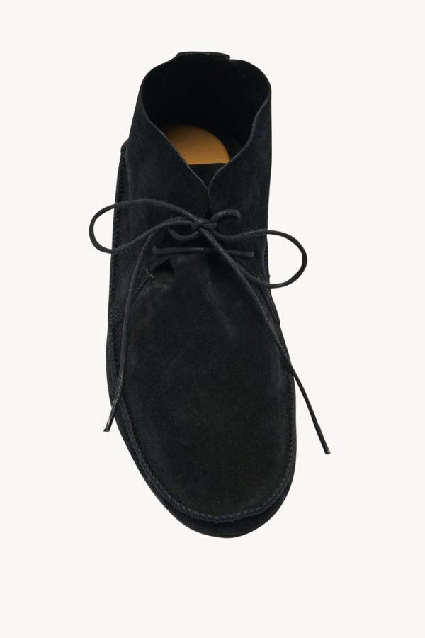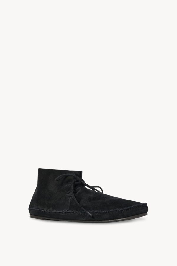 Lace-up shoe in soft calfskin suede with oval toe, raised outer stitching, and rubber sole.