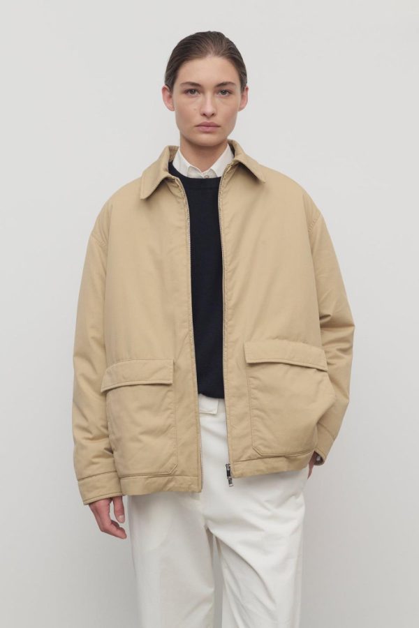Collared jacket in cotton and cashmere gabardine with buckled straps at side waist, front patch pockets, and two-way front zip closure.