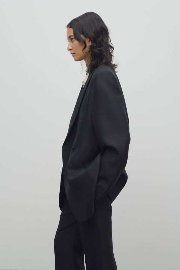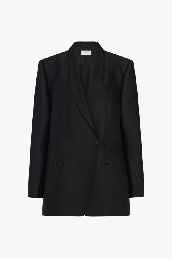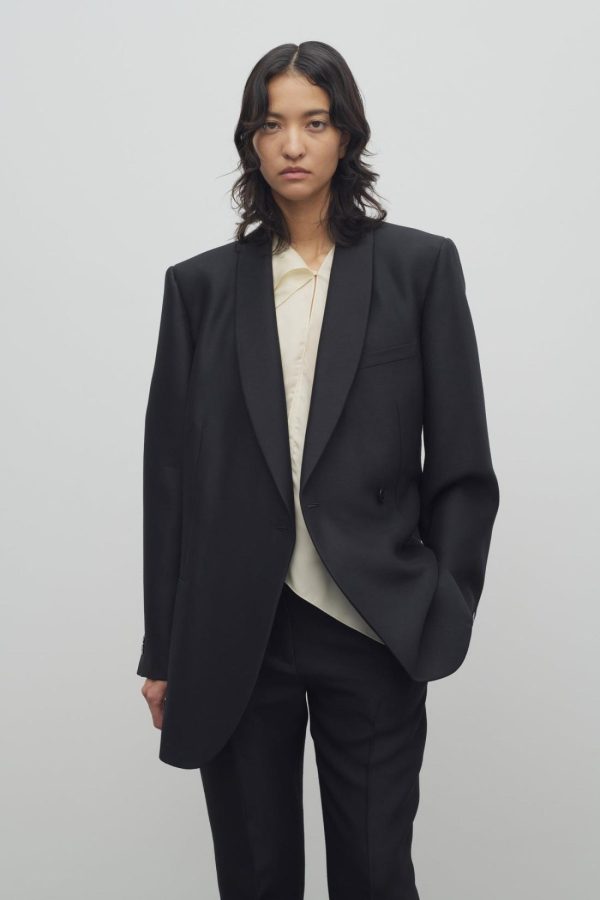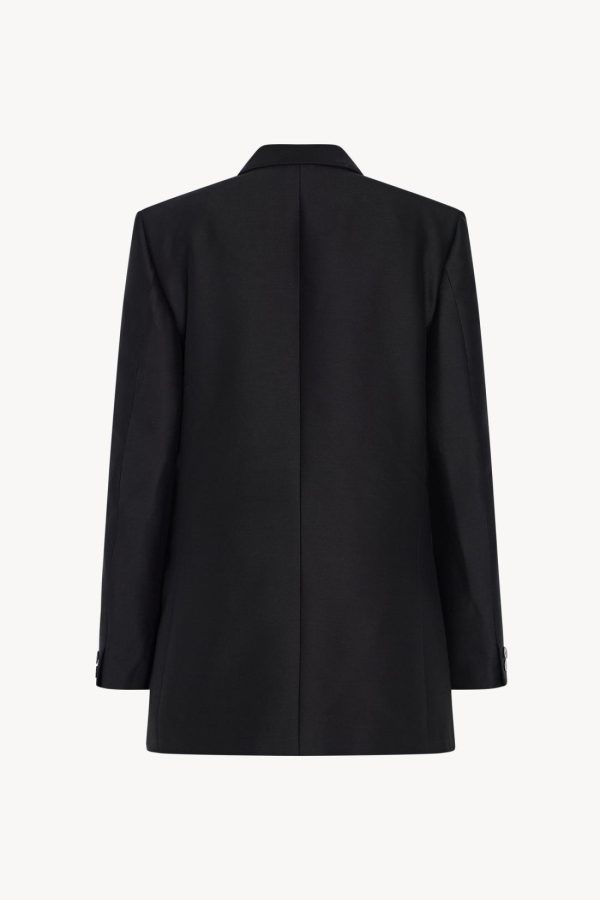 Double-breasted smoking jacket in lightweight wool and silk suiting with double horn button closure, front chest and besom pockets, and regular fit.