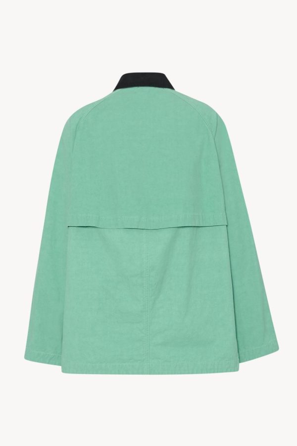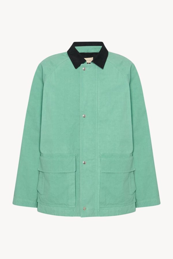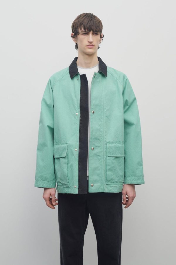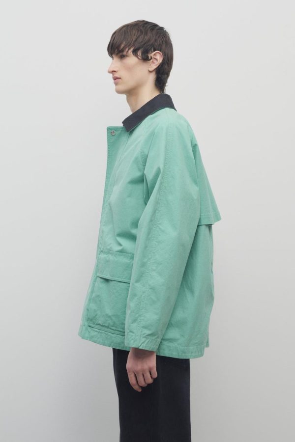Outdoor jacket in washed Japanese cotton canvas with back storm flap, front patch pockets, and concealed front placket with snap and zipper closure.