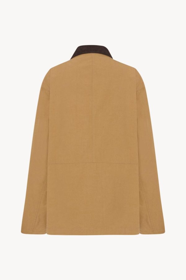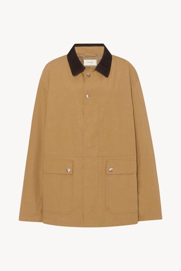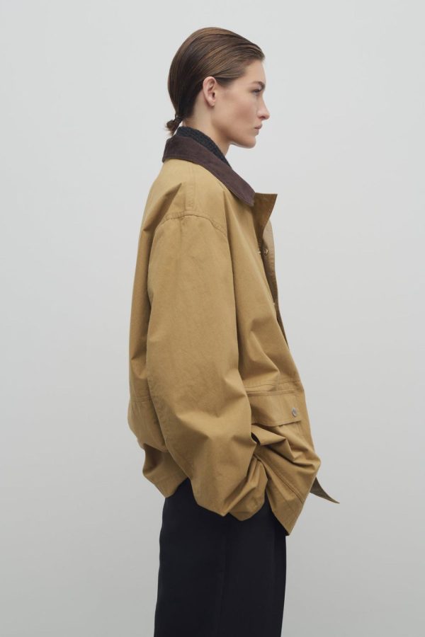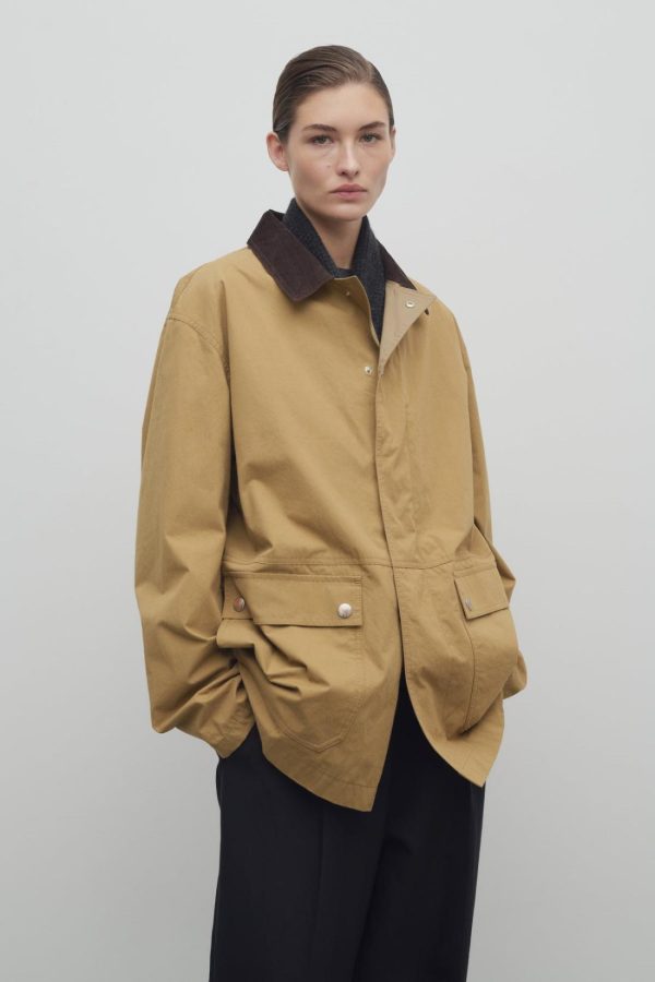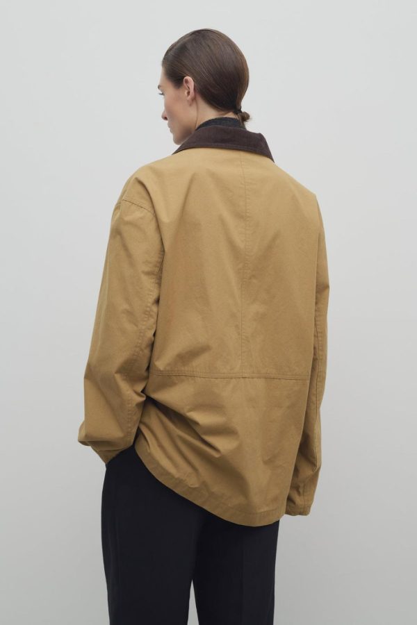 Outdoor jacket in enzyme-washed cotton with contrast corduroy collar, front patch pockets, and concealed front placket with snap and zipper closure.