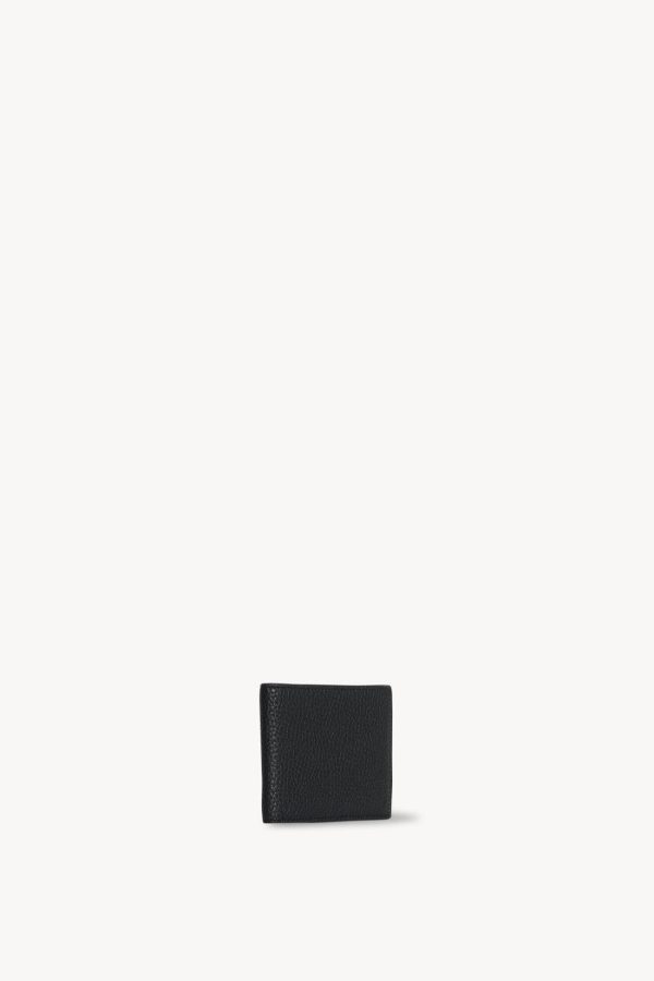 Compact wallet in pebbled calfskin leather with multiple card slots, inner bill slot, and embossed logo on interior side.