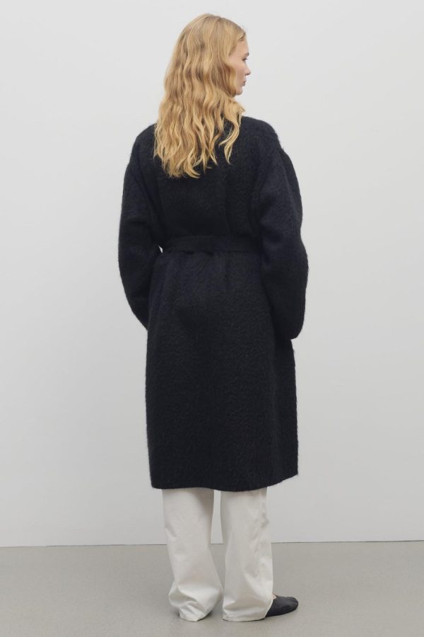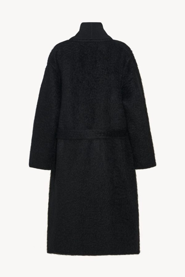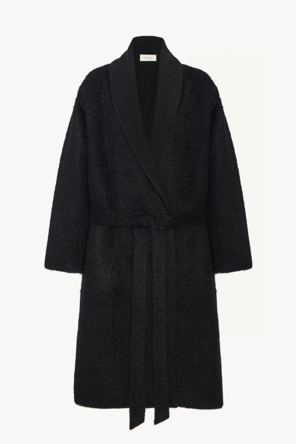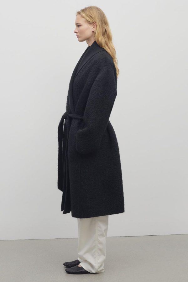 Knee-length wrap coat in textured double-faced alpaca and virgin wool with folded shawl collar, self belt, and side seam pockets.