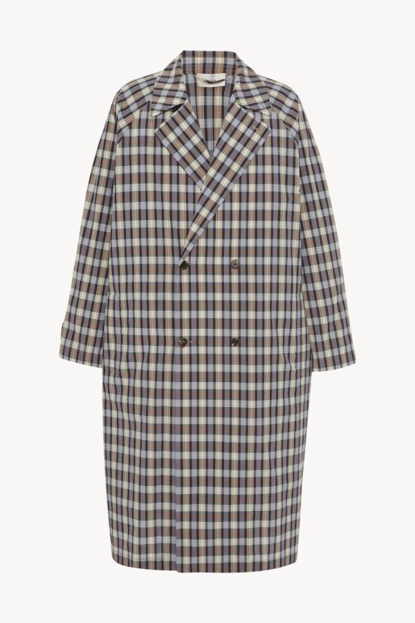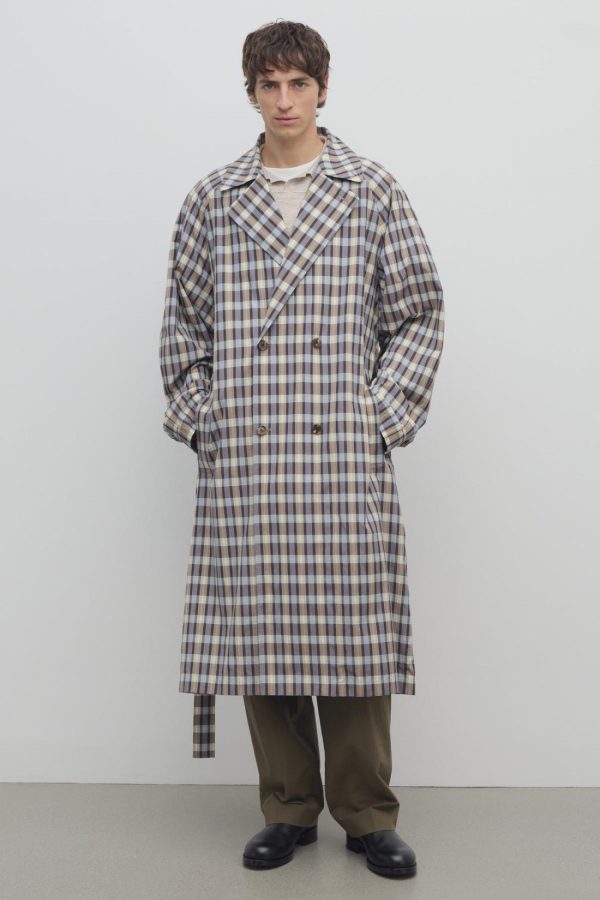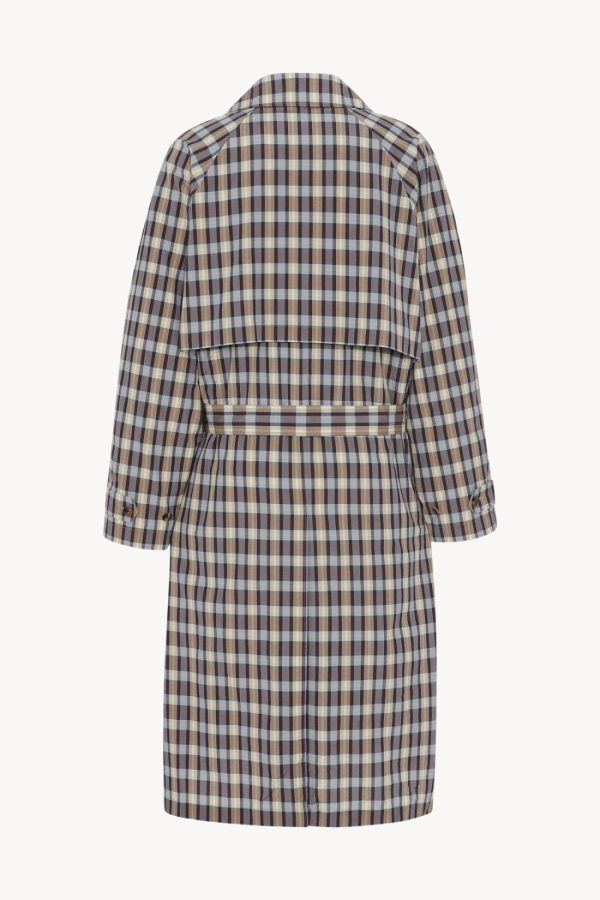 Double-breasted trench coat in structured silk with notched lapel, side welt pockets, removable belt, and horn button closure.