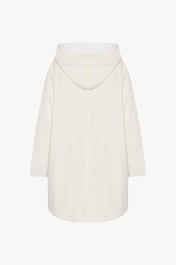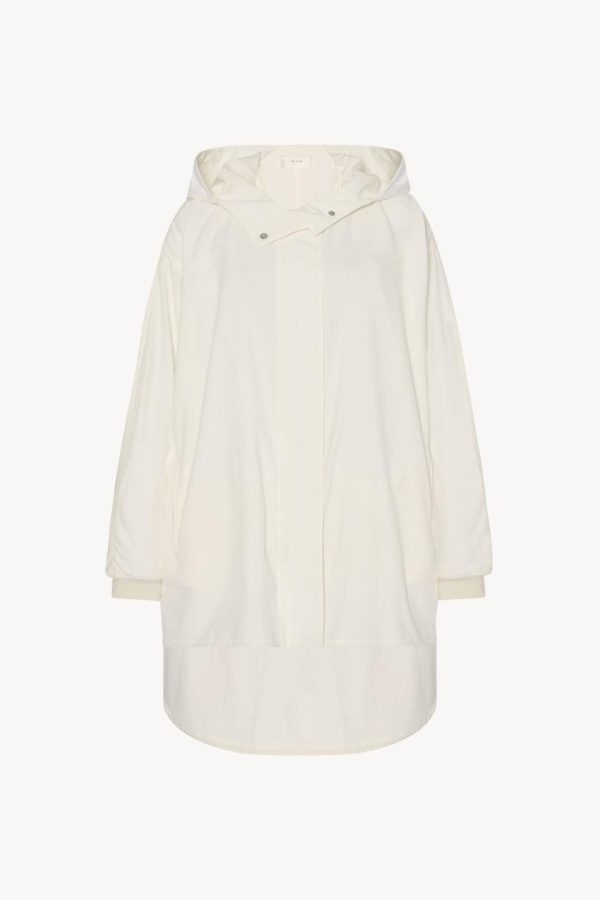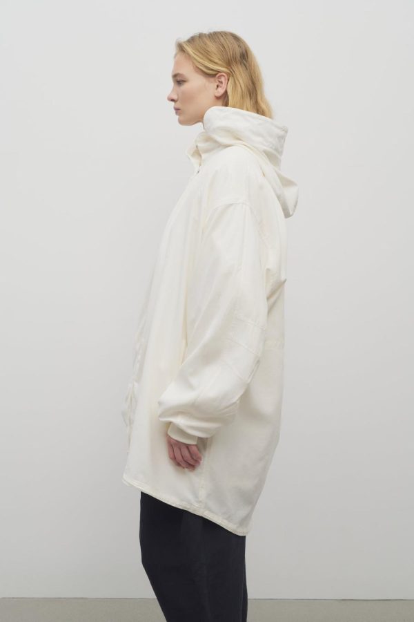 Oversized hooded parka in washed silk toile with ribbed cuffs, interior drawstring at waist, and concealed front placket with snap and zipper closure.