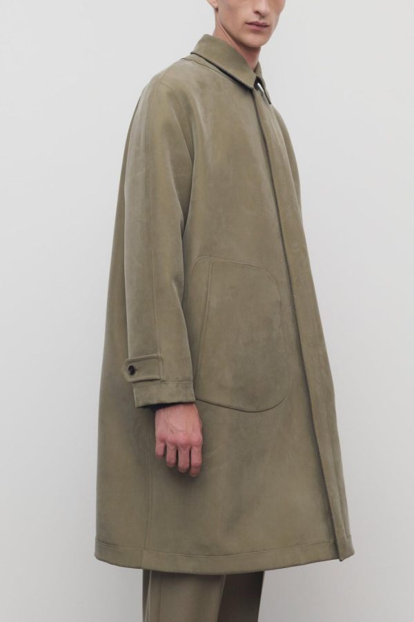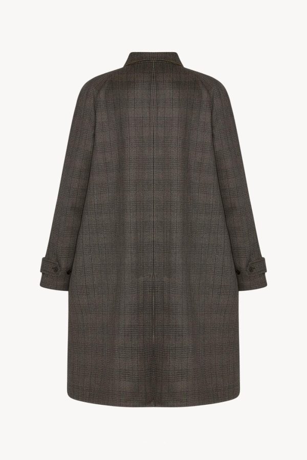 Reversible single-breasted car coat in glen check virgin wool and silk with raglan construction, patch and welt pockets, and concealed front placket with button closure.