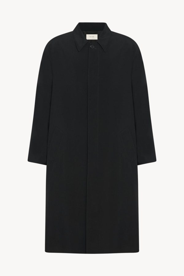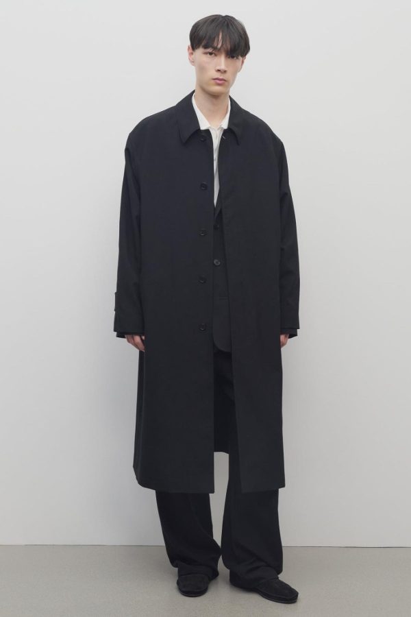 Single-breasted trench coat in crisp tropical wool with back storm flap, front welt pockets, and concealed front placket with horn button closure.