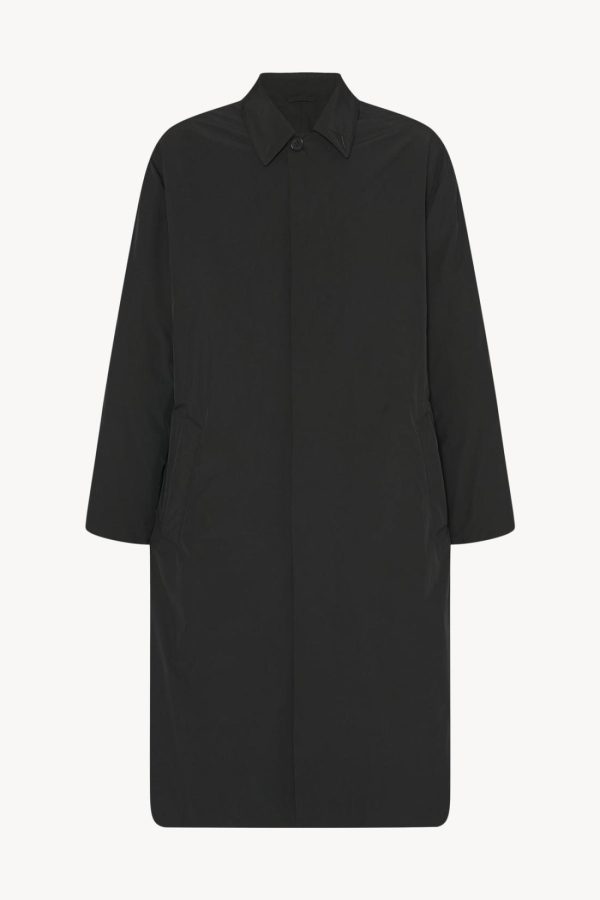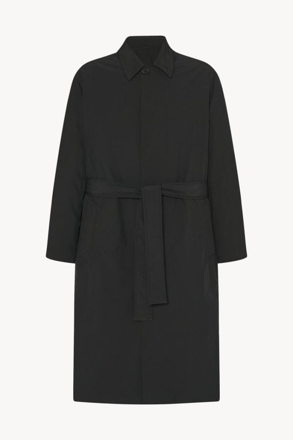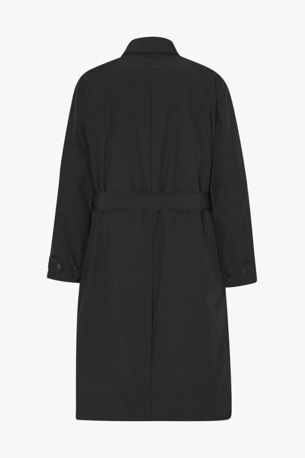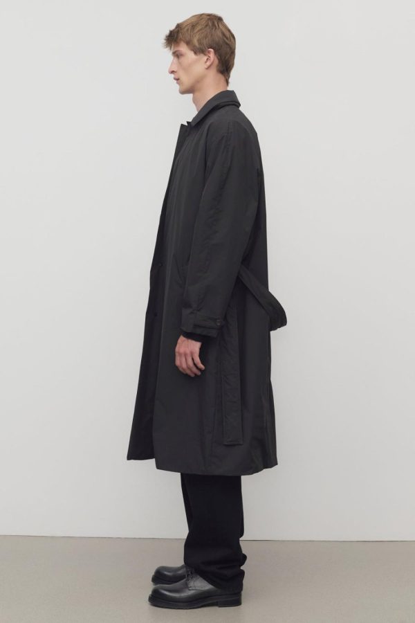Single-breasted trench coat in water-repellant technical fabric with removable belt, slant welt pockets, and concealed front placket with button closure.