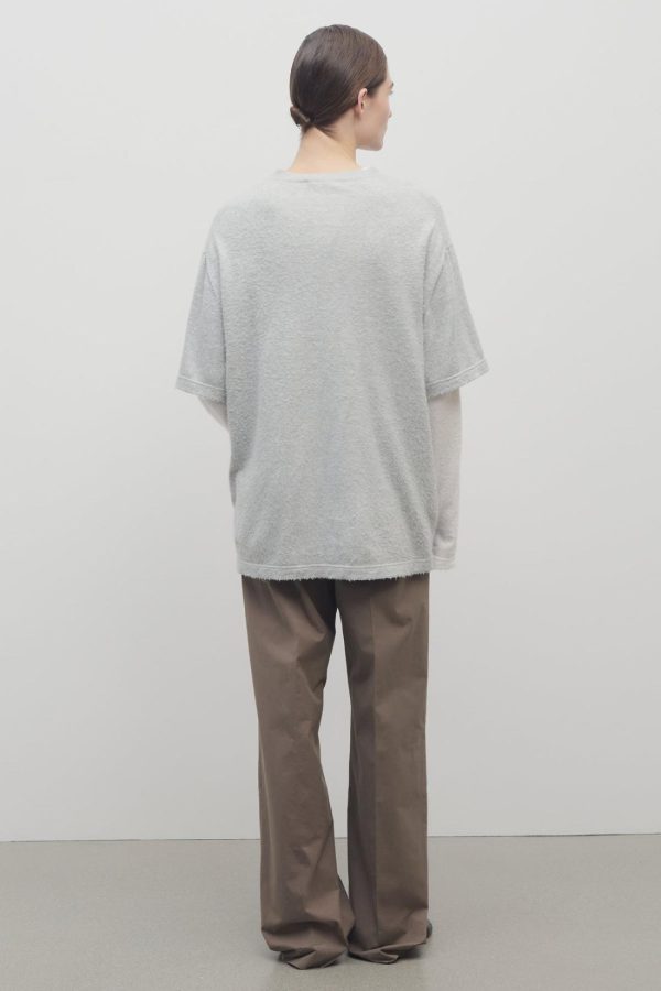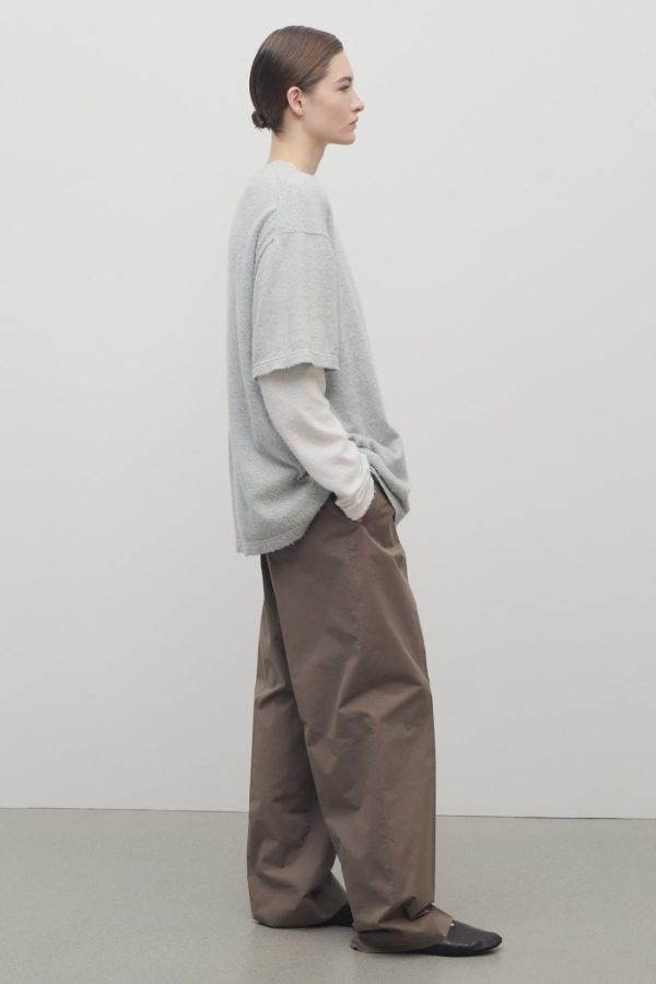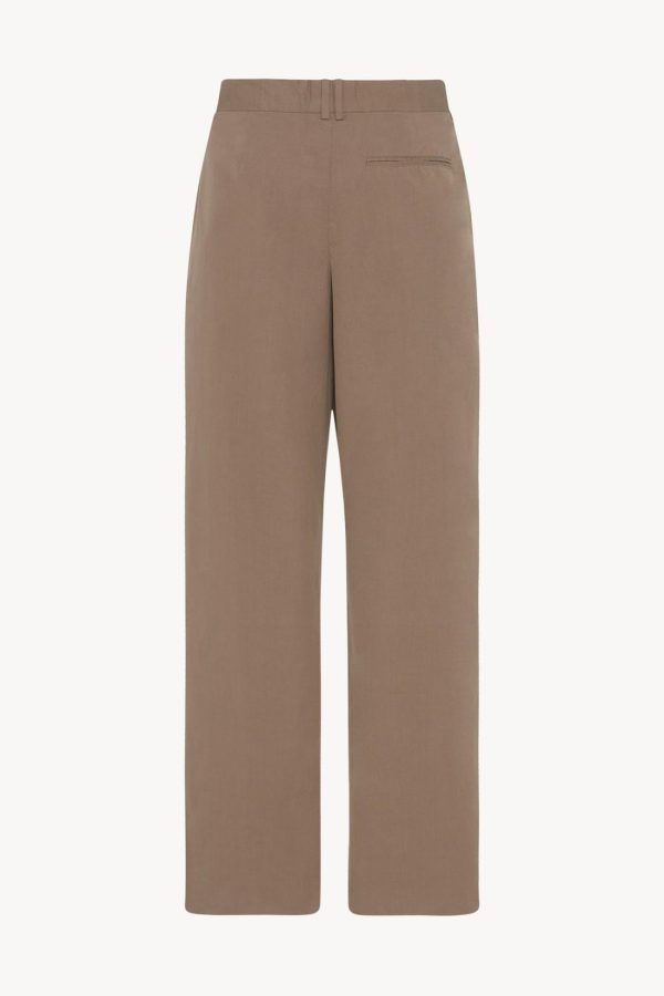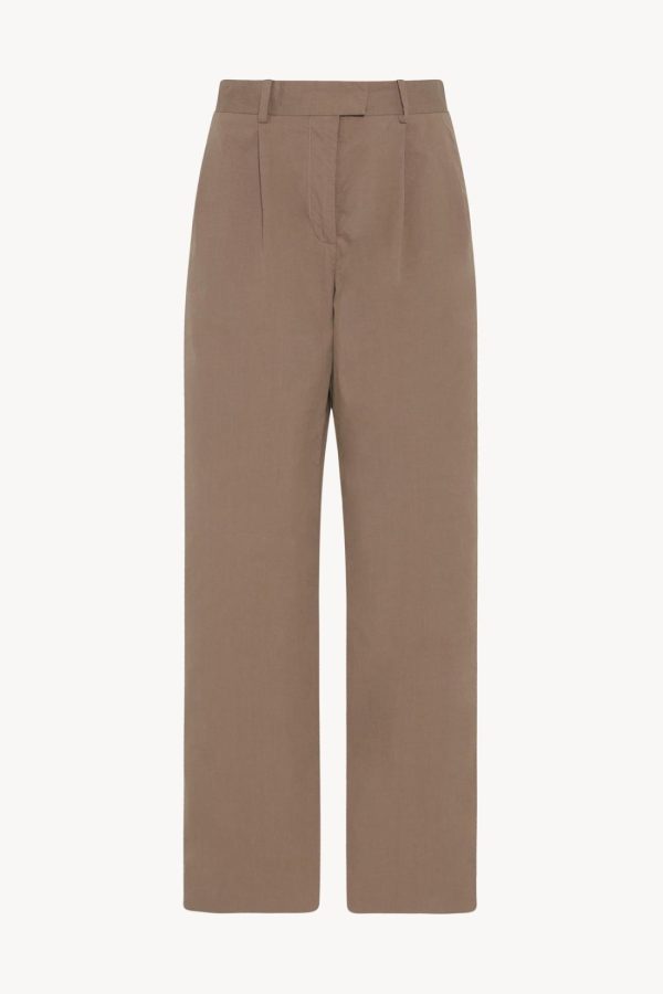 Low-rise tailored trouser in smooth Pima cotton with straight leg, front double pleats, and side welt pockets.