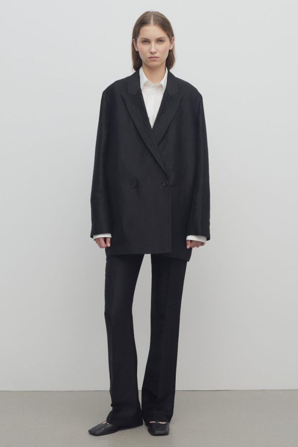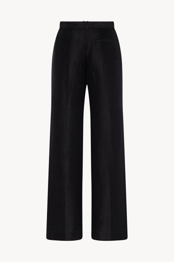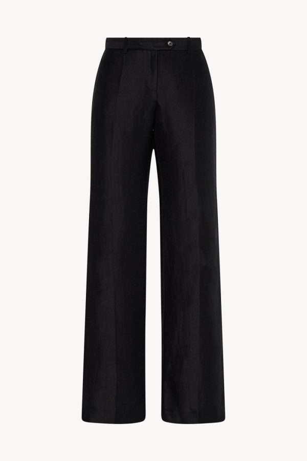 Mid-rise tailored trouser in textured linen with straight leg, pressed front and back creases, and slanted side pockets.