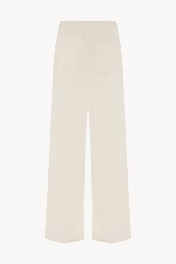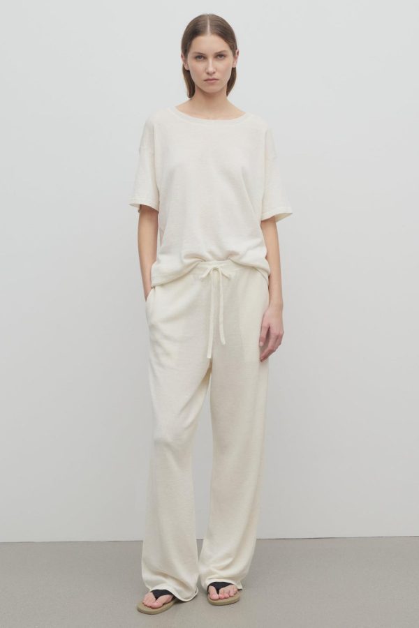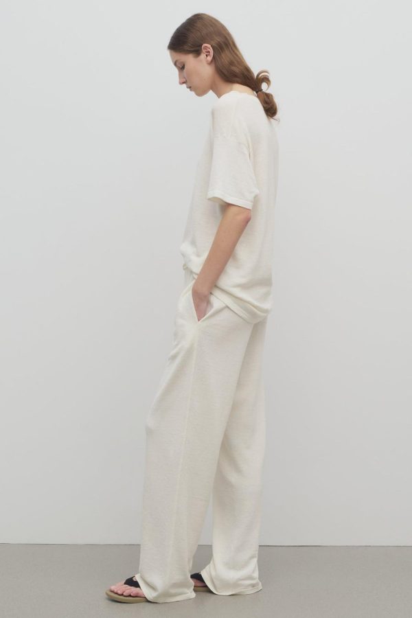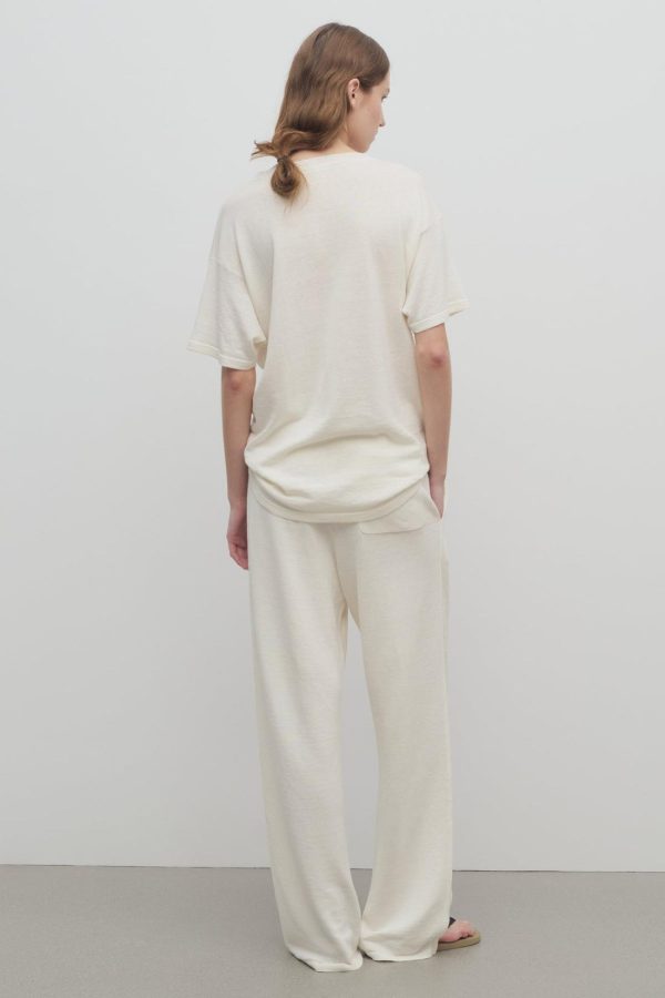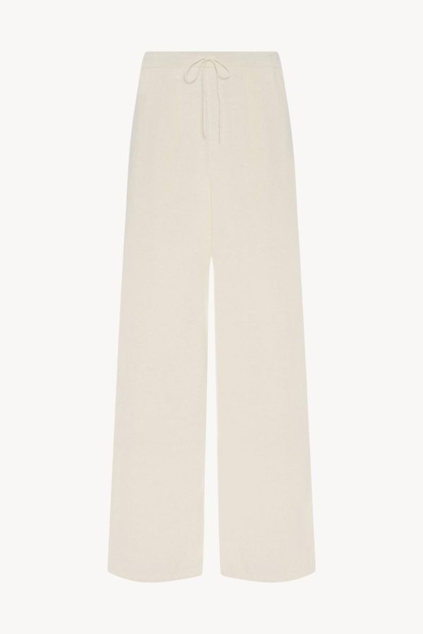 Relaxed pant in textured linen knit with wide leg, back patch pocket, and drawstring waistband.