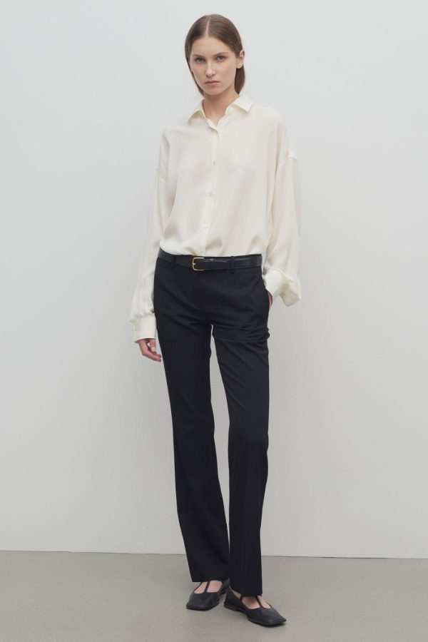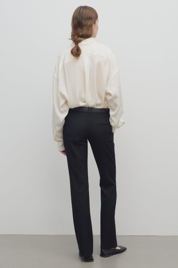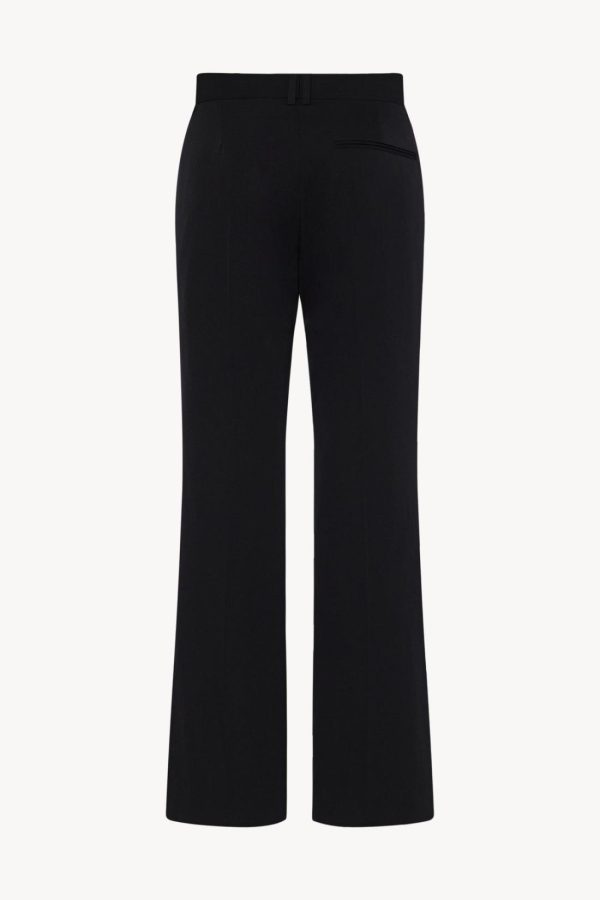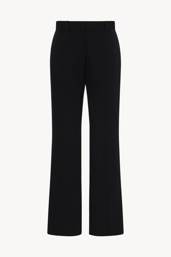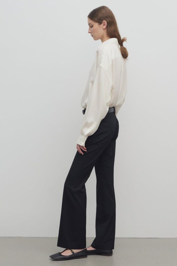 Low-rise trouser in textured wool with slanted side pockets, pressed front and back creases, and slightly flared hem.