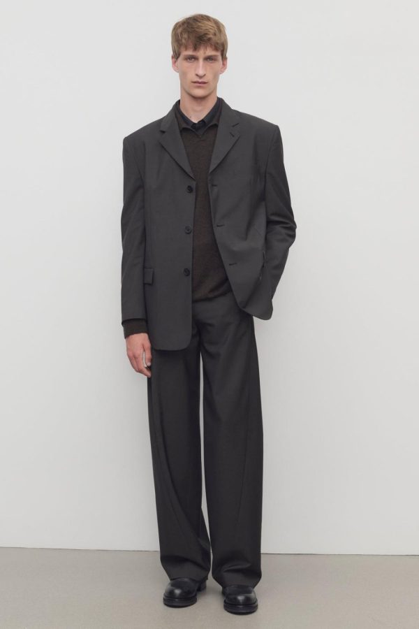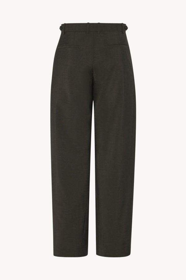 Relaxed mid-rise trouser in lightweight virgin wool and mohair with straight leg, twisted seam detail, and side seam pockets.