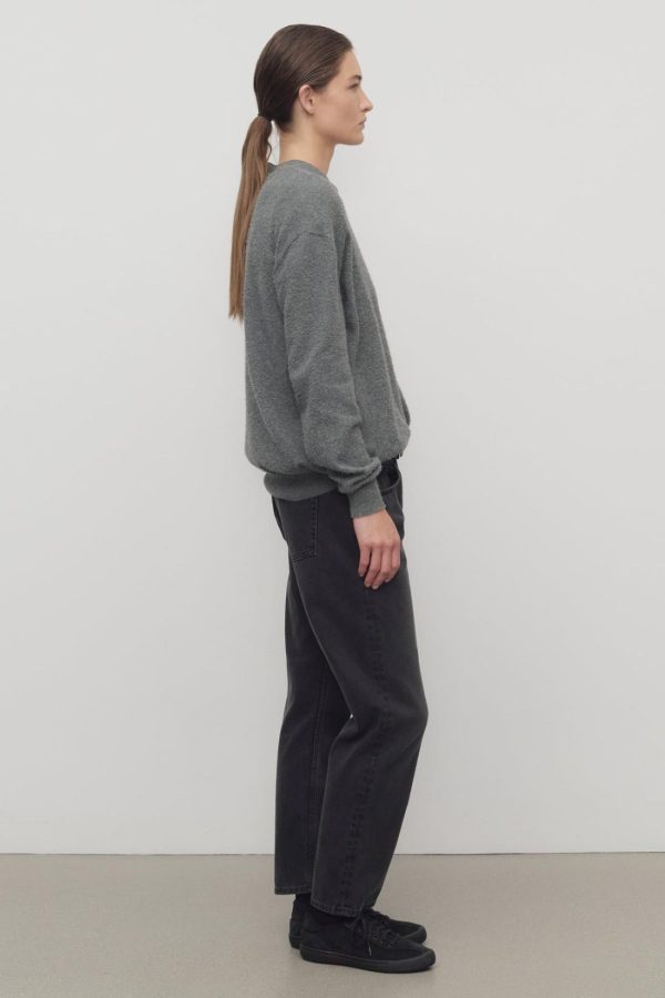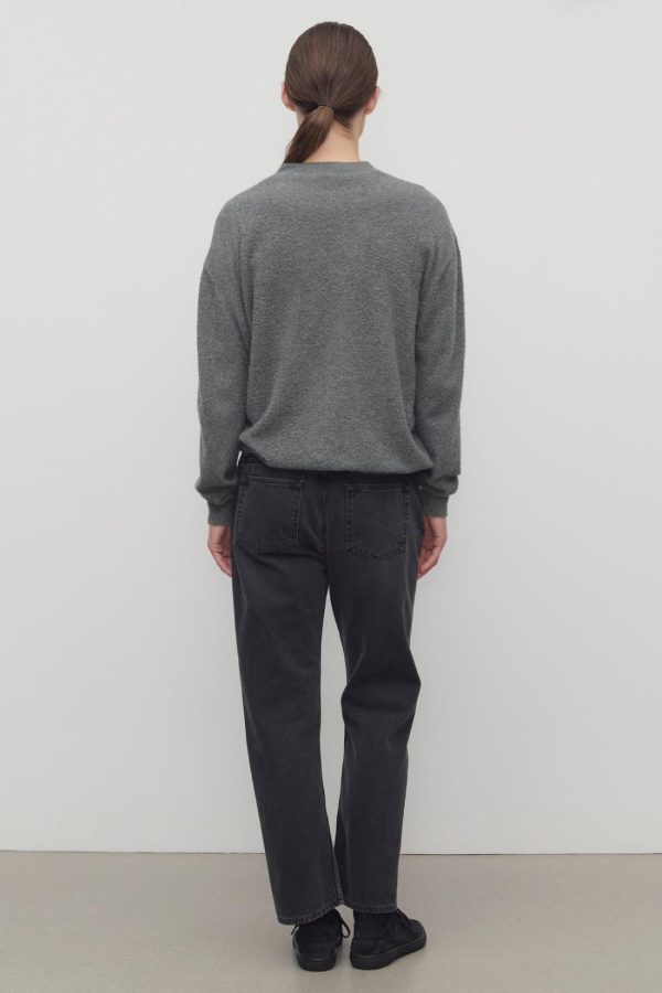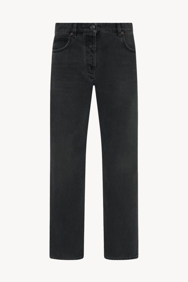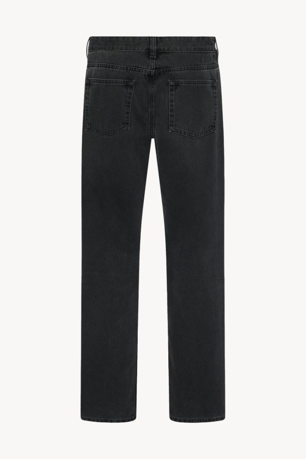 Mid-rise jean in in gently faded cotton denim with slim leg, tonal topstitching, and classic 5-pocket construction.
