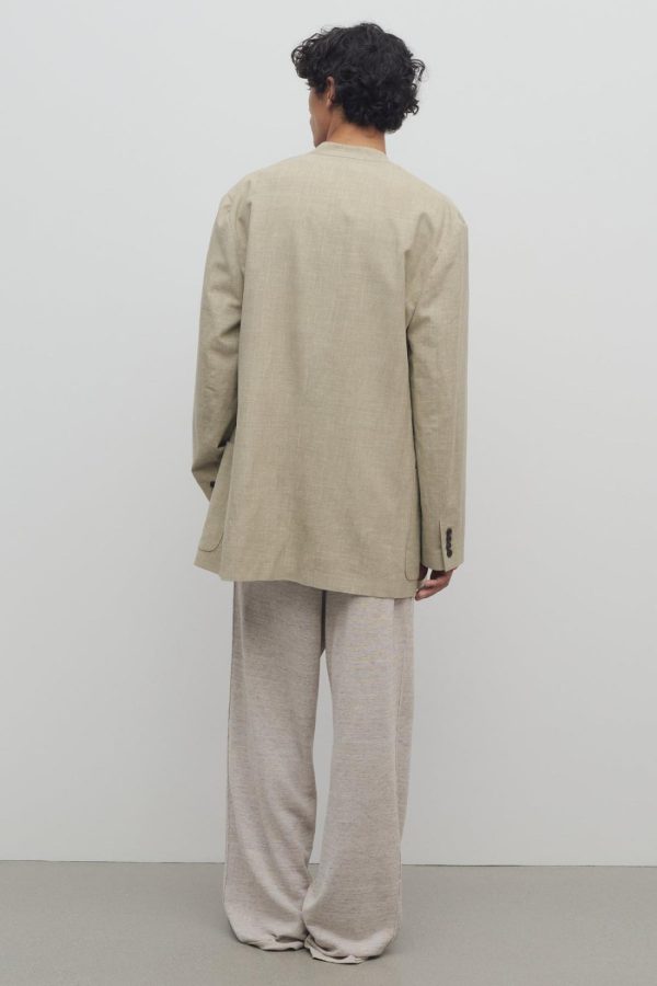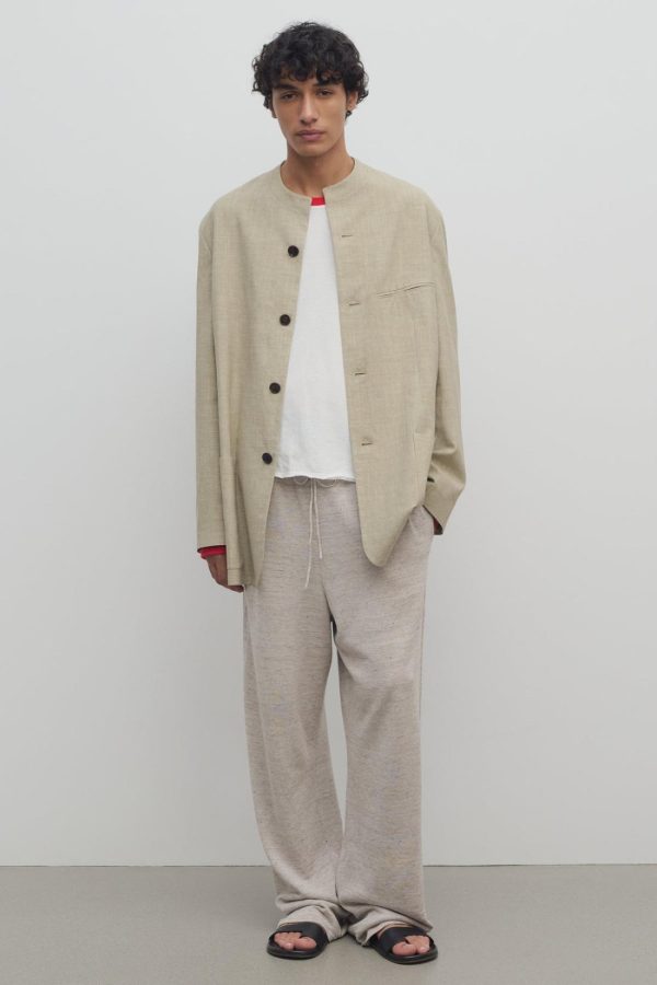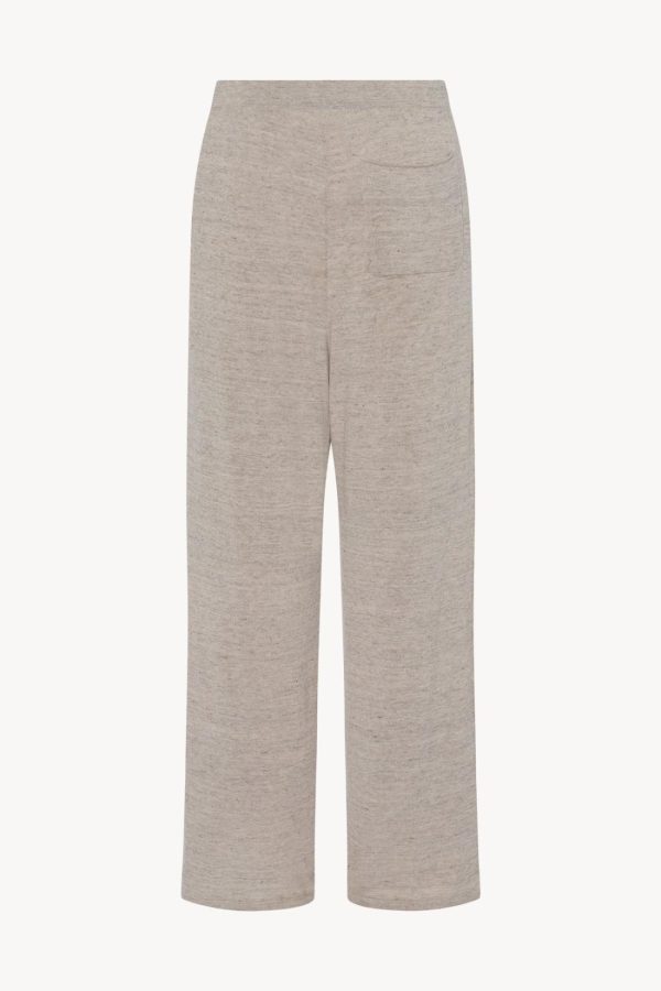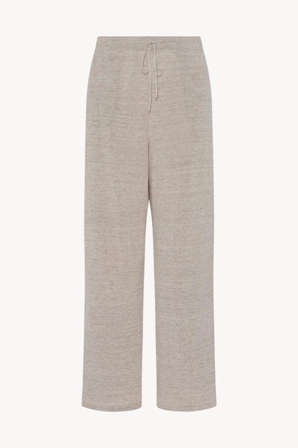 Relaxed wide leg pant in textured linen and cotton knit with side seam pockets and elasticated waistband with drawstring closure.