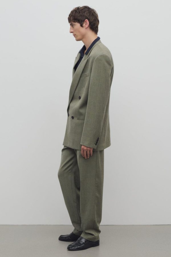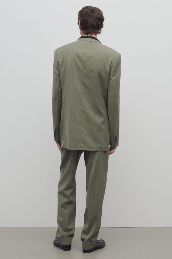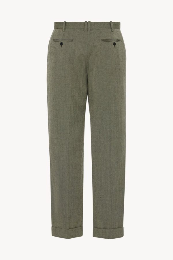 High-rise tailored trouser in herringbone wool with front and back creases, slanted side and back welt pockets, and cuffed hem.
