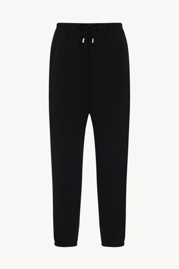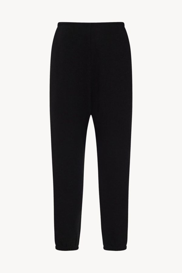 Mid-rise pant in cashmere and cotton French terry with slightly tapered leg, drawstring waist, and side seam pockets.