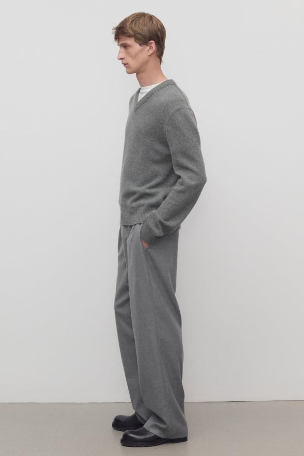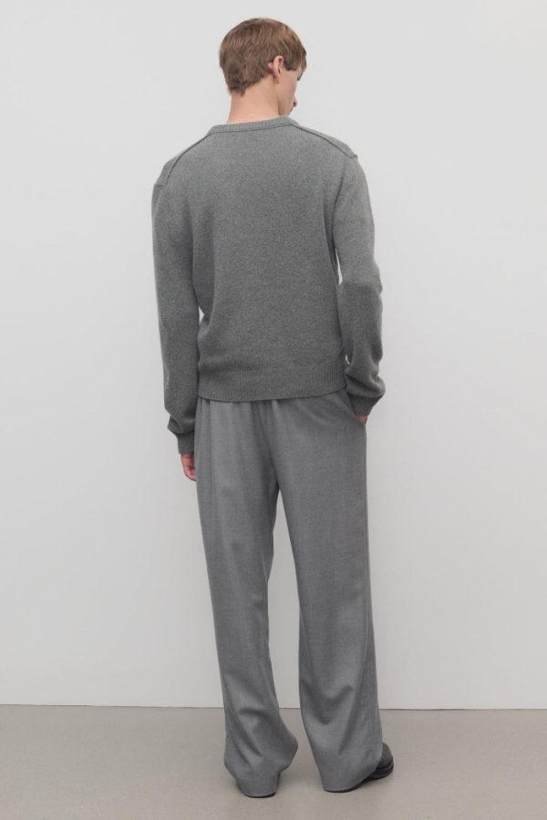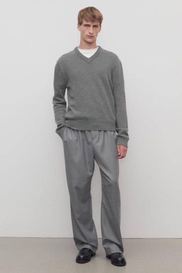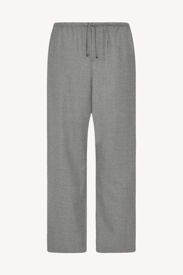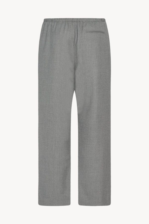 Relaxed pull-on pant in virgin wool flannel with wide, straight leg, elasticated drawstring waist, and side seam pockets.