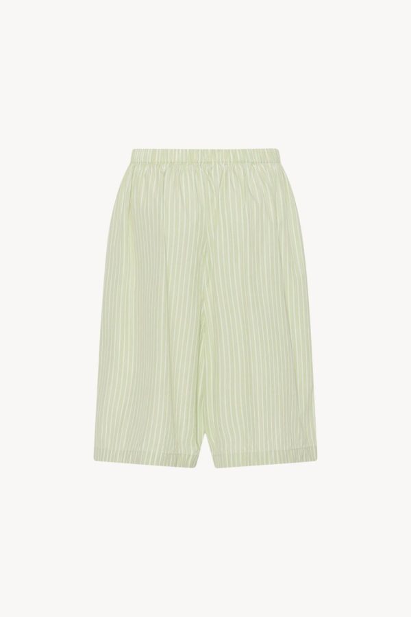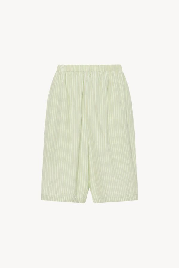 Mid-rise pajama short in Japanese cotton poplin with gathered elastic waistband, side seam pockets, and above-the knee length.