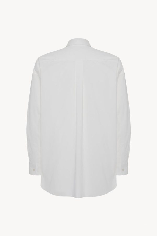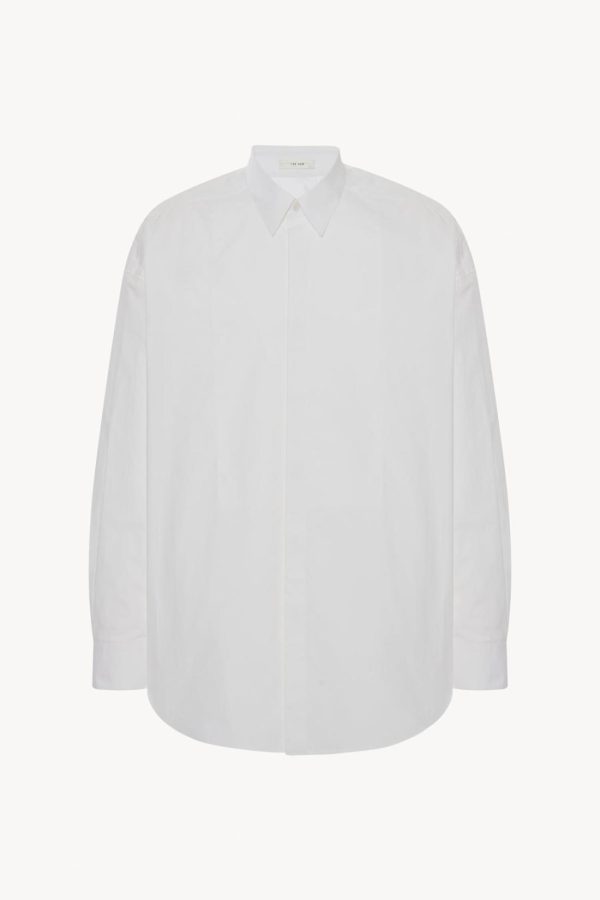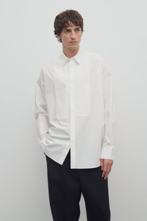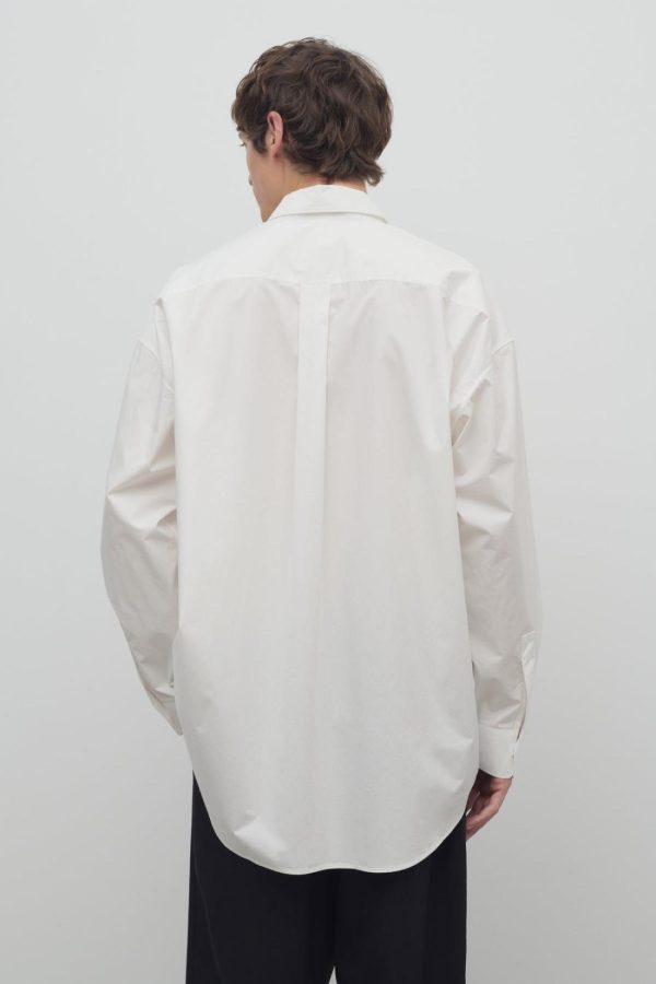 Minimal button-up shirt in structured cotton poplin with relaxed fit, front plastron, and concealed front placket with mother-of-pearl buttons.
