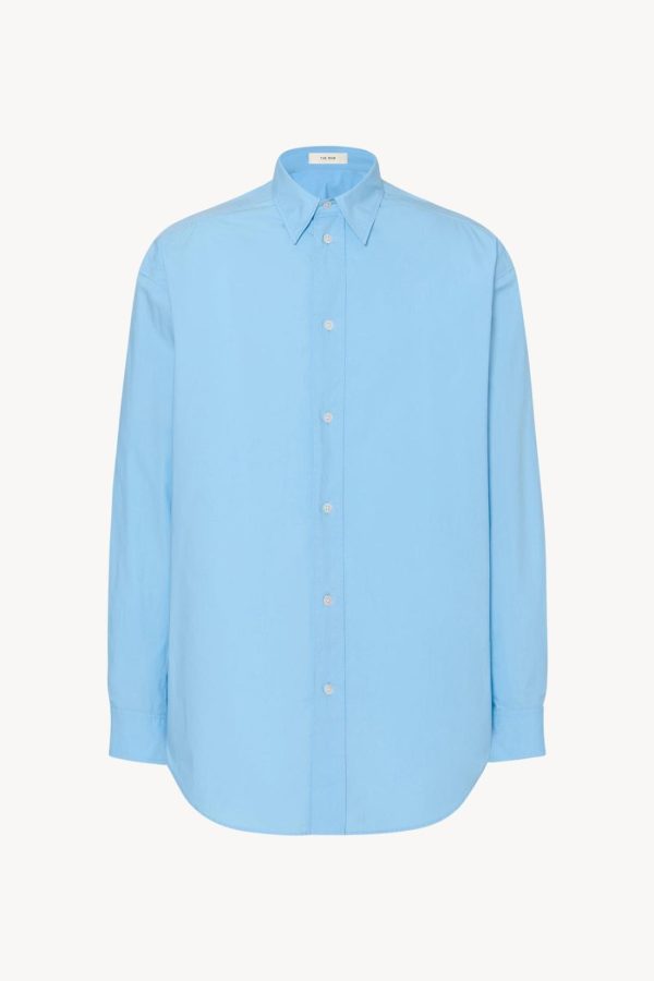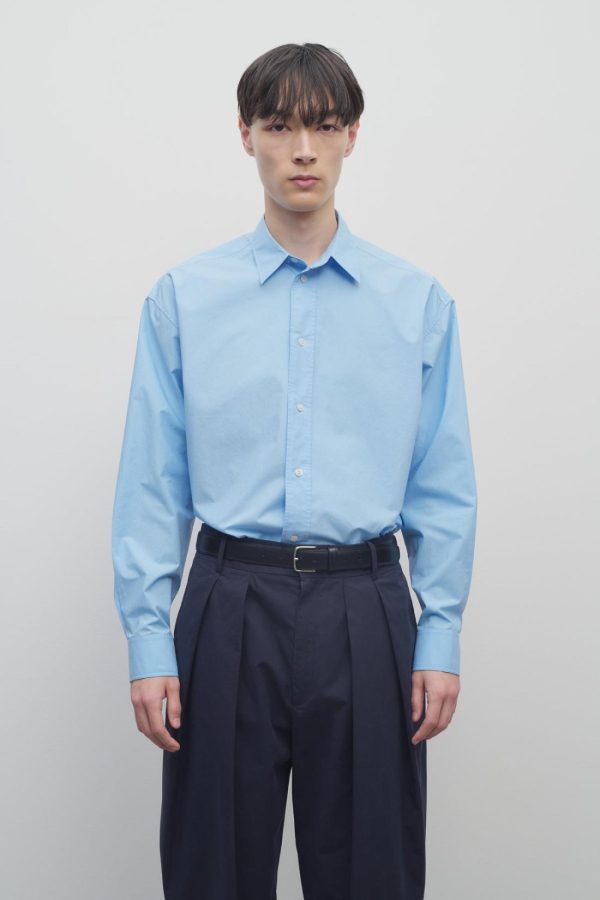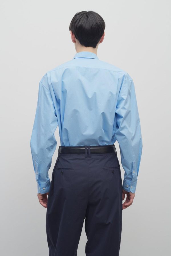 Classic button-up shirt in washed cotton poplin with slim back yoke, curved hem, and exposed front placket with mother-of-pearl buttons.