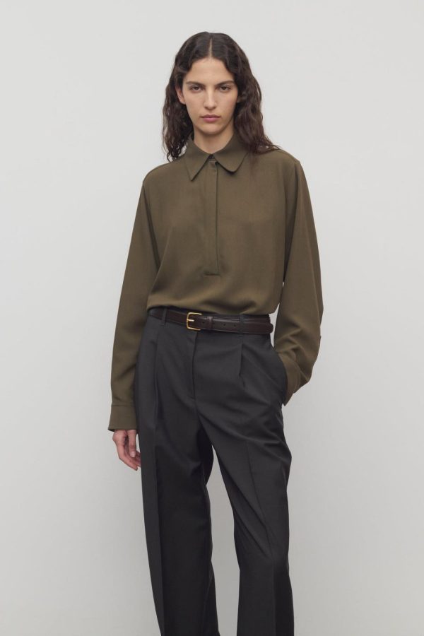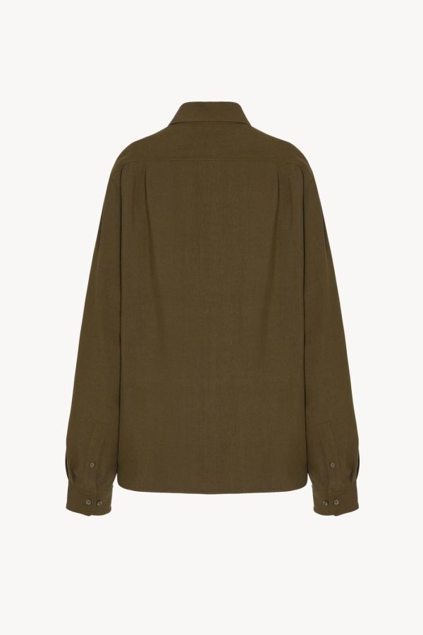 Oversized collared shirt in lightweight silk crepe with curved, layered hem, overlayer with metal zip closure, and concealed front placket at underlayer with mother-of-pearl buttons.