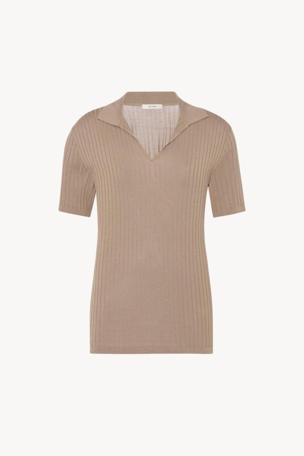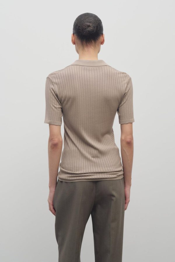Short-sleeved polo top in fluid viscose silk with open front placket, ribbed collar, and slim fit.