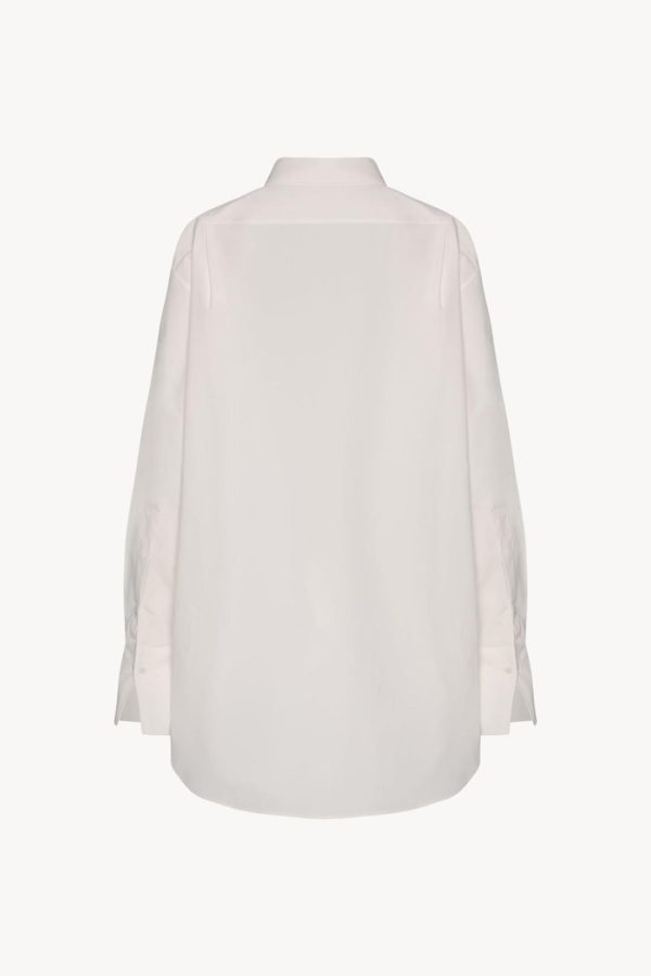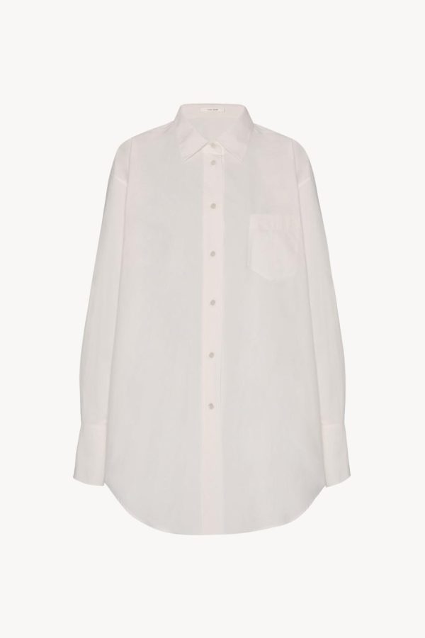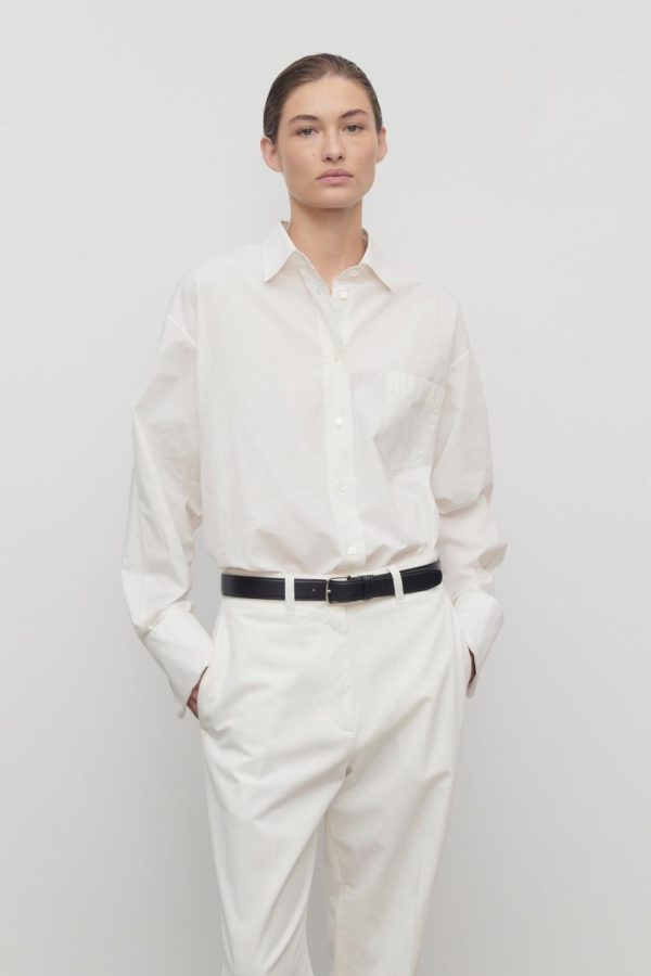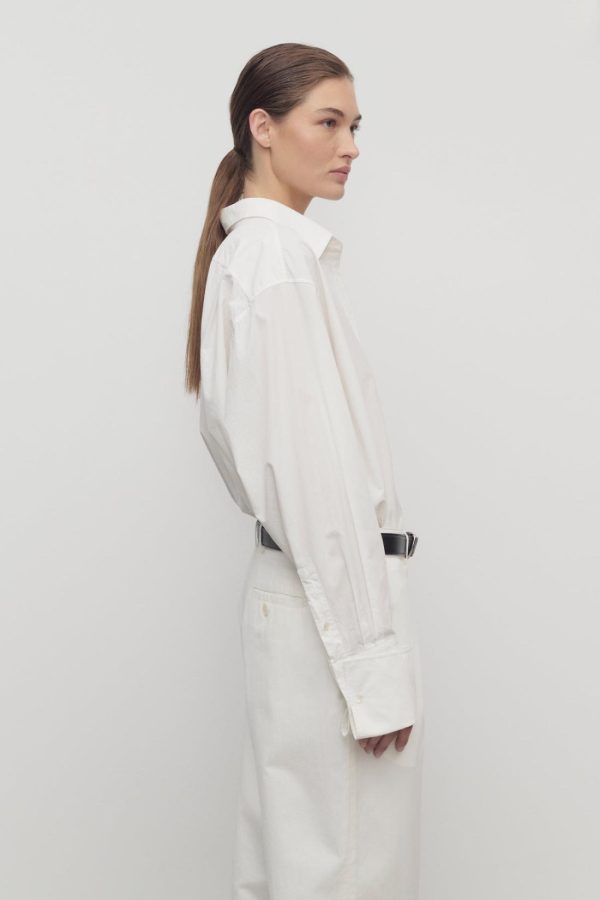 Classic button-up shirt in sanded cotton poplin with front patch pocket, elongated cuffs, and exposed front placket with mother-of-pearl buttons.