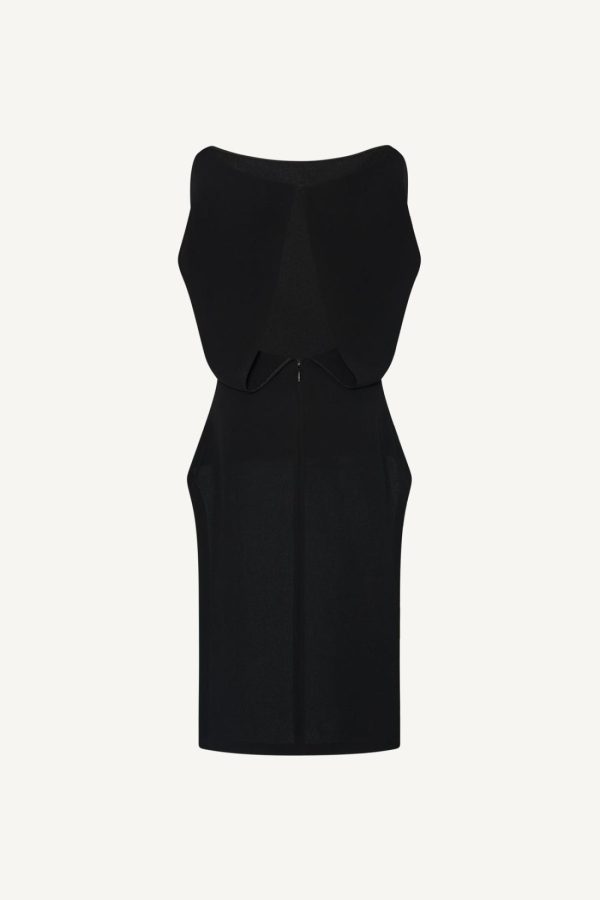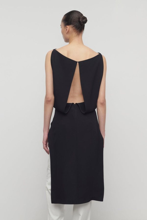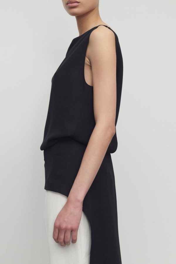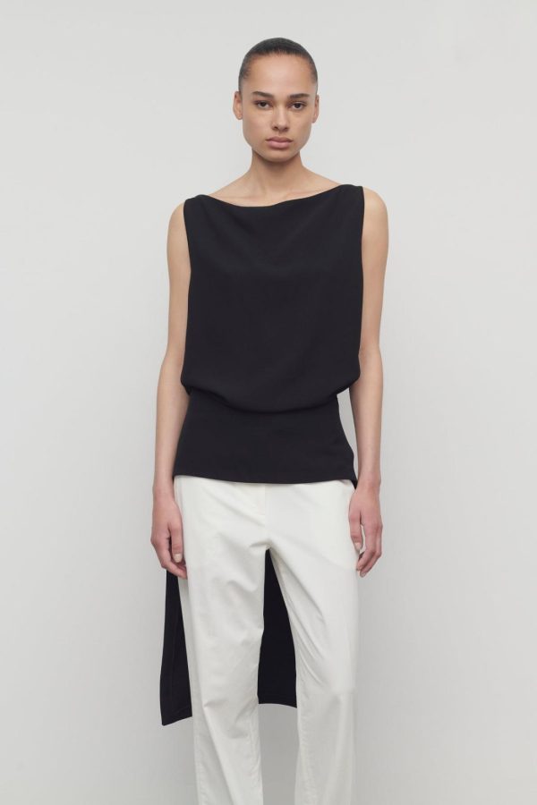 Sleeveless boatneck top in crisp, lightweight silk with loose fit and extended back panel.