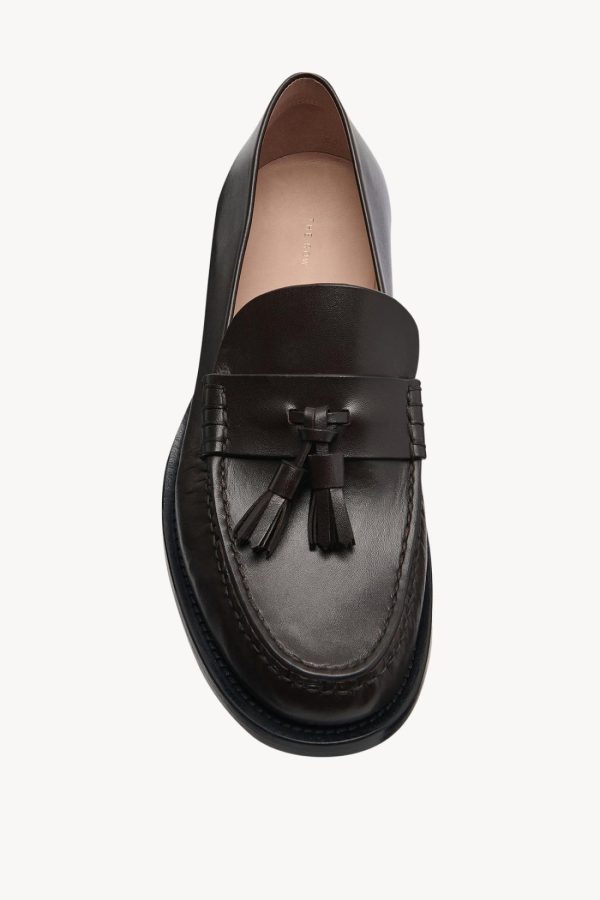 Classic loafer in polished calfskin leather with almond toe, leather tassel detail, and hand-stitched construction.
