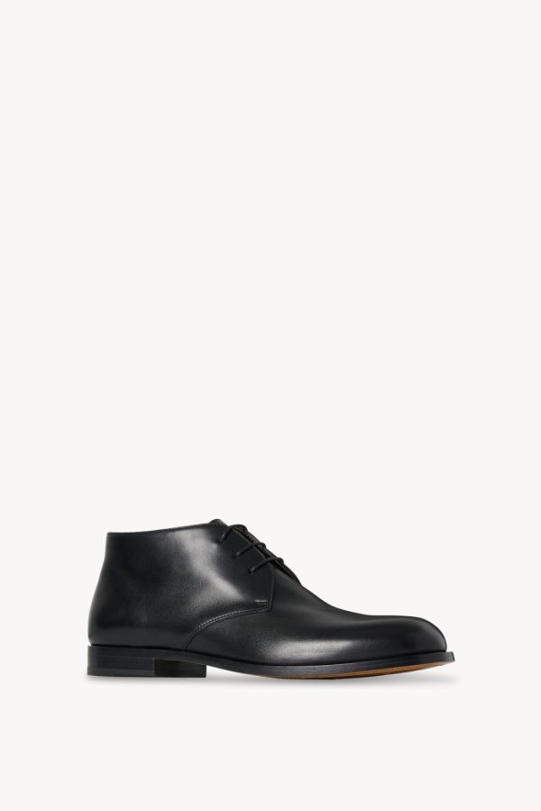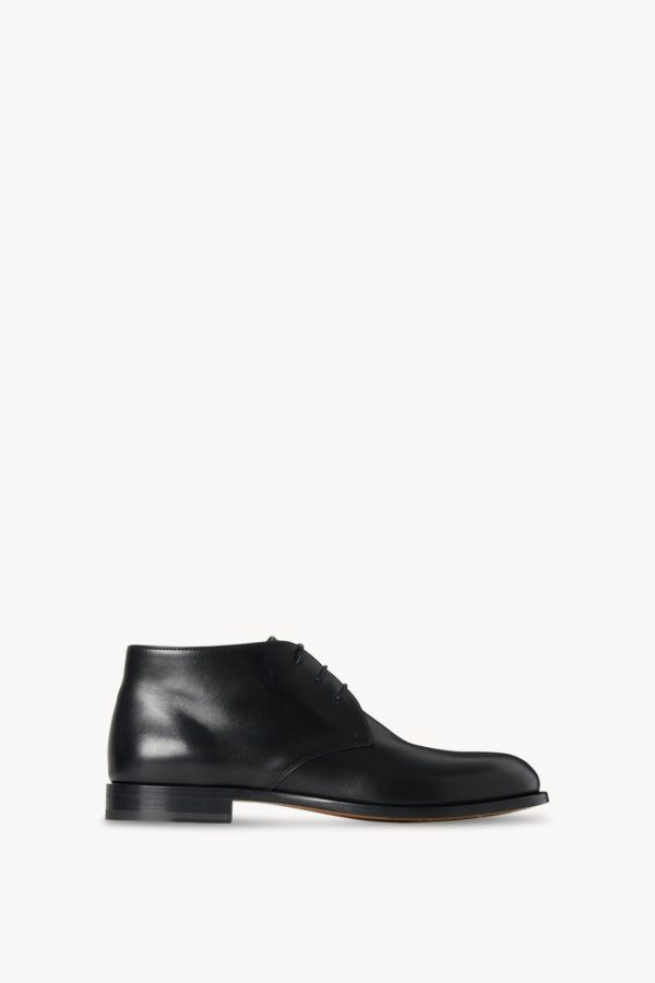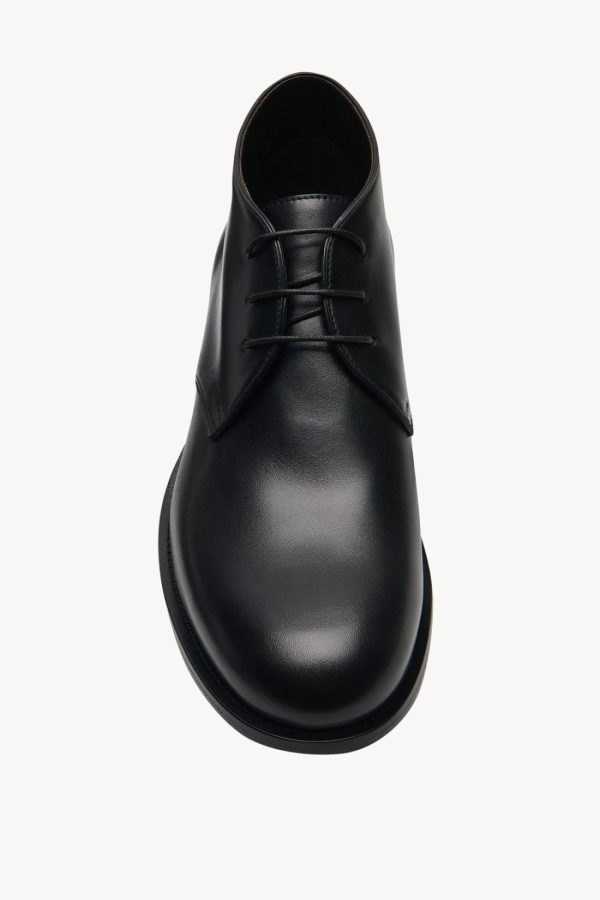 Classic Oxford boot in polished calfskin leather with almond toe, laced front, and stacked heel.