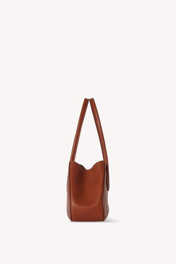 Geometric shoulder bag in polished saddle leather with tubular handles, flat base, and hand-stitched construction.