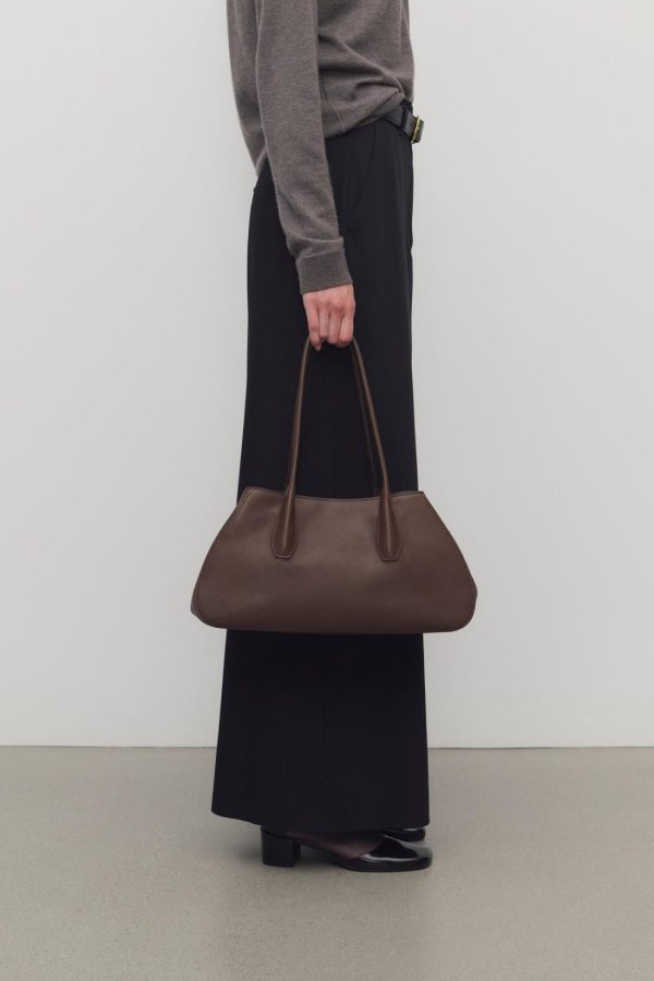 Geometric shoulder bag in polished saddle leather with tubular handles, flat base, and hand-stitched construction.