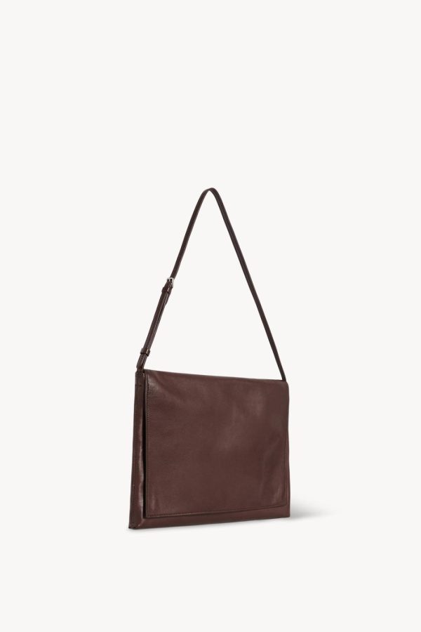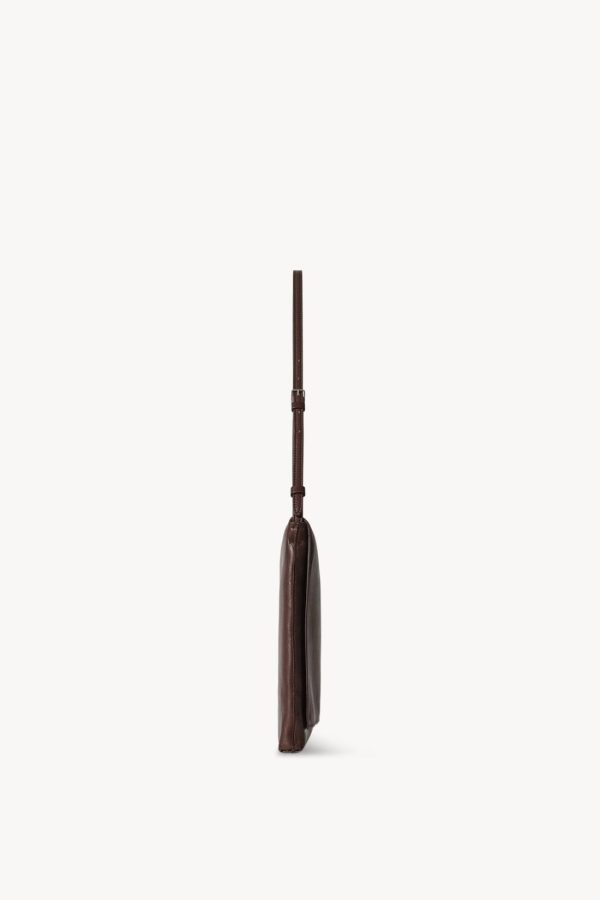 Compact shoulder bag in buttery lambskin leather with overlapped front flap, removable interior zip pocket, and adjustable strap with metal buckle.