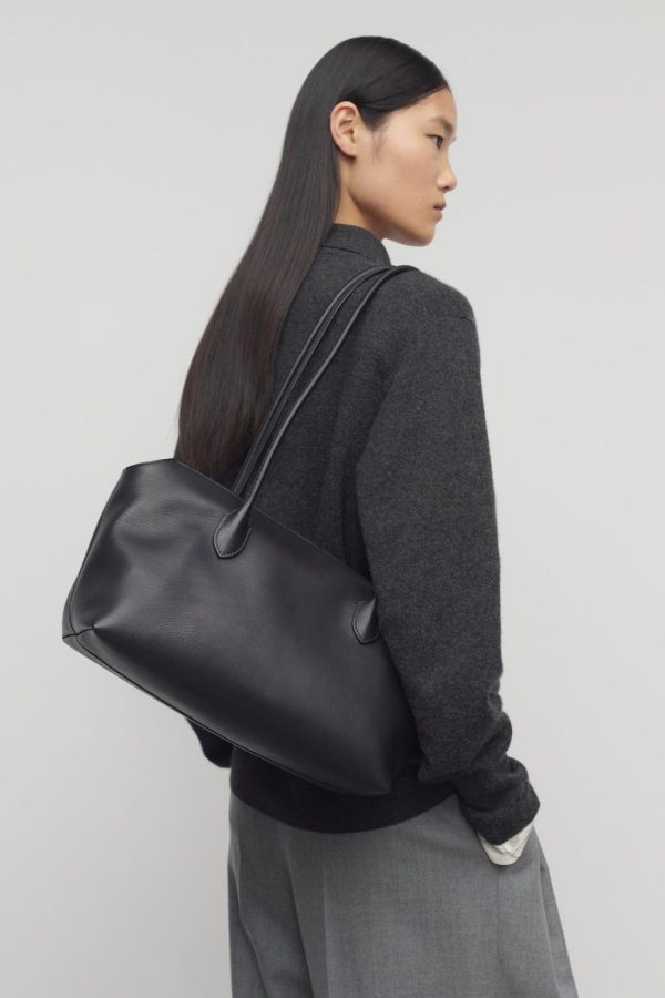 Softly structured shoulder bag in finely grained calfskin leather with tubular straps, angled top edges, and discrete zipper closure.