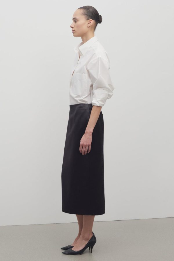 Calf-length pencil skirt in heavyweight silk satin with double-faced construction and zipped center back detail.