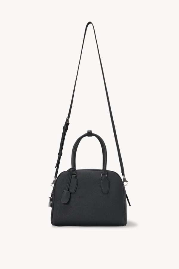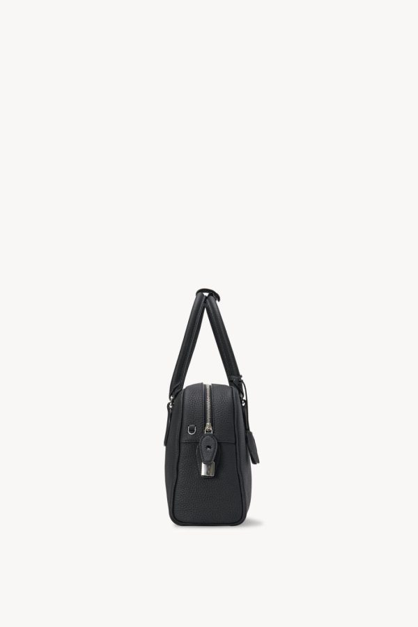 Updated bowling bag in textured calfskin leather with tubular handles, branded metal padlock and key, and zipper closure.