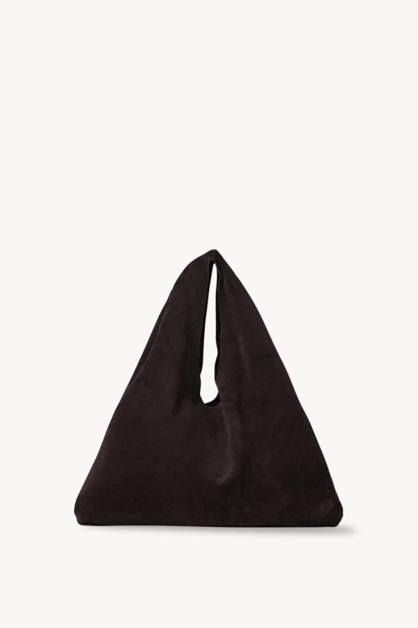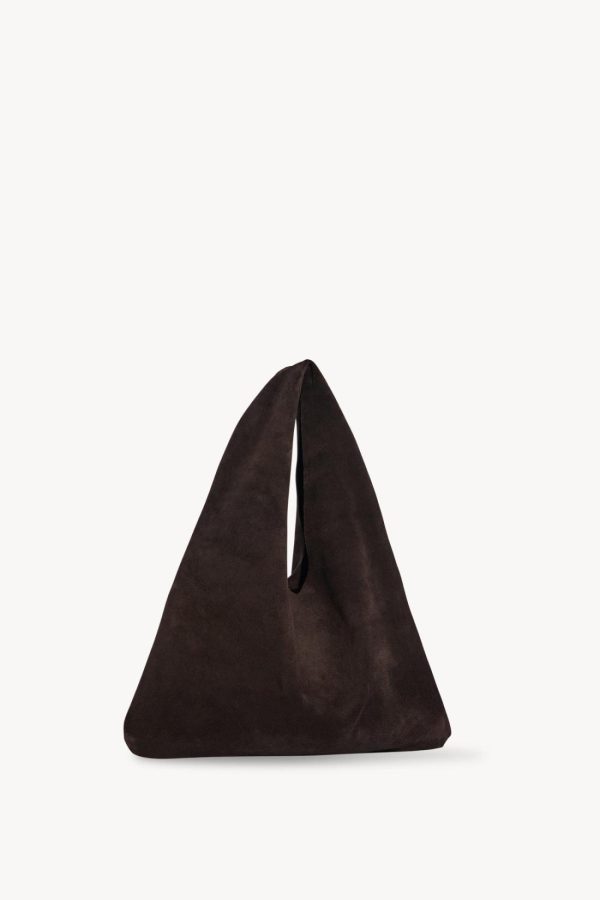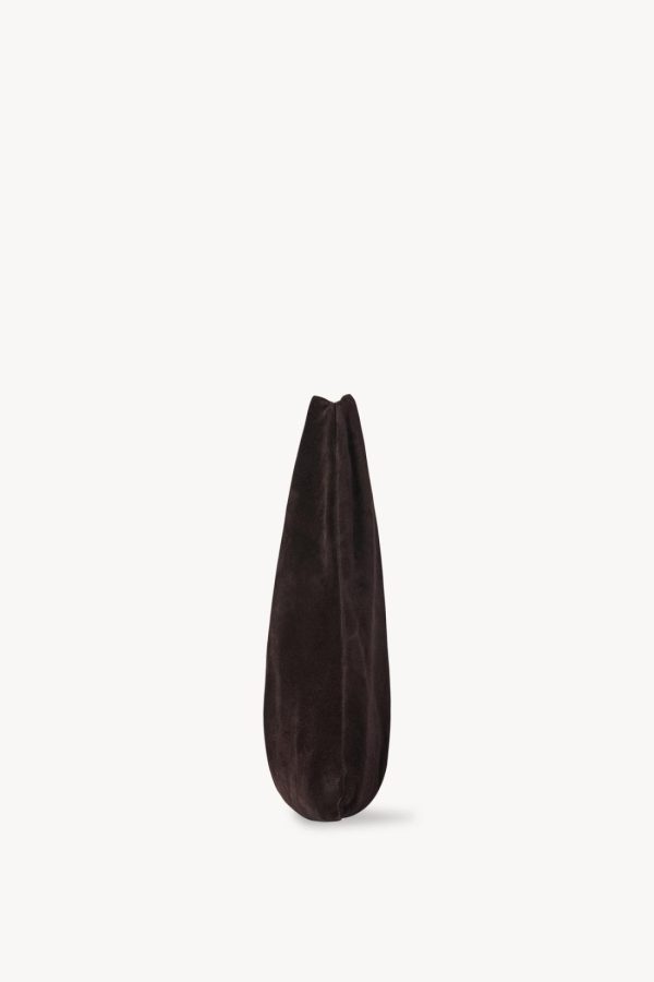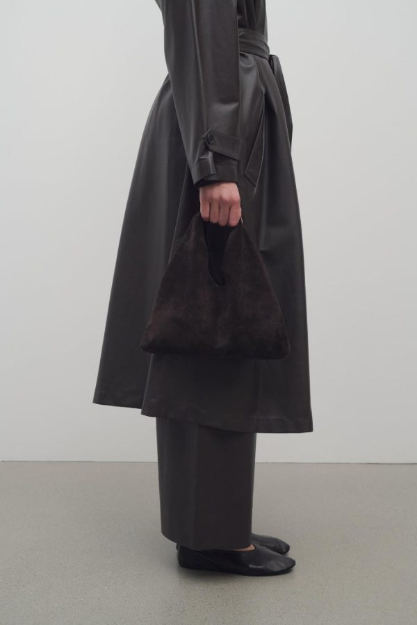 Unstructured handbag in soft suede with single seam, draped handle, and single interior pocket.