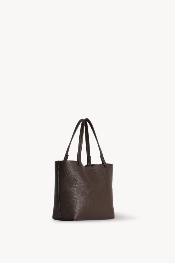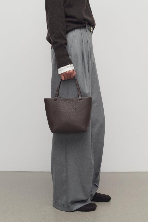 Small classic tote bag in textured calfskin leather with detachable shoulder strap, interior toggle closure, and flat handles.
