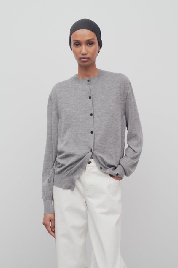 The Row Essentials cardigan sweater in superfine cashmere knit with finely ribbed neckline, cuffs and hem.