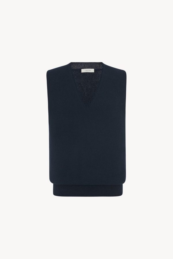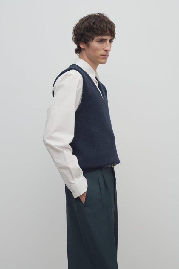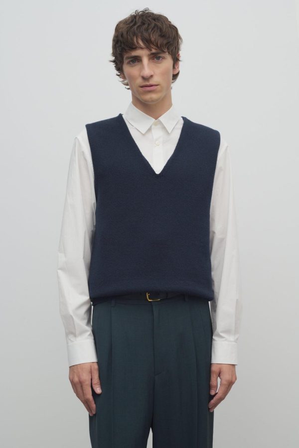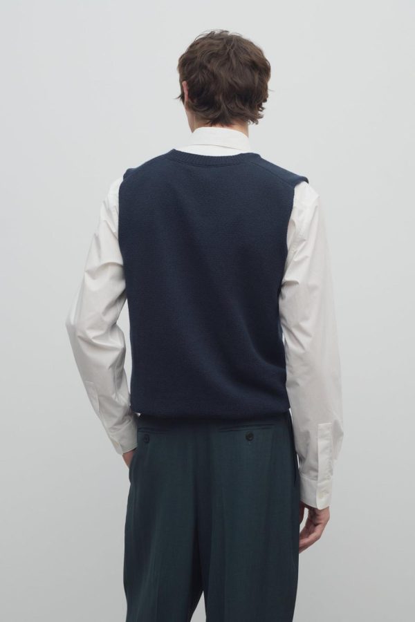 Classic v-neck sweater vest in finely knit wool and cotton with ribbed hem and back neckline.