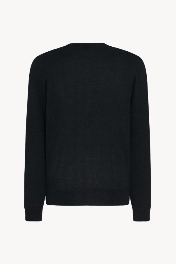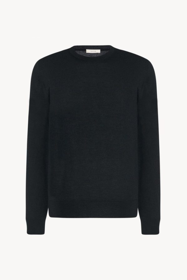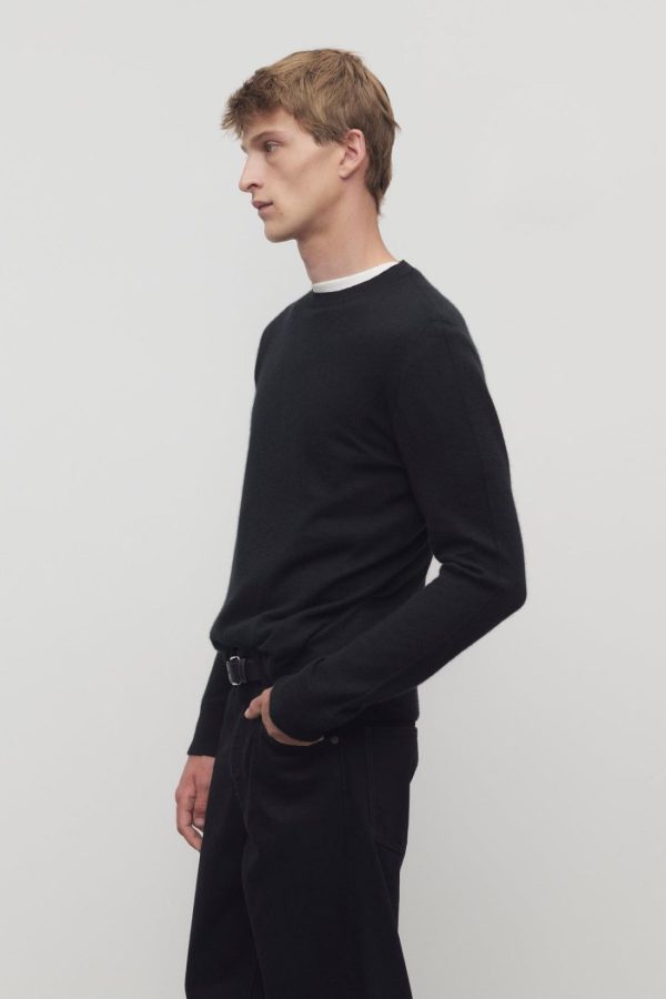 Classic crewneck sweater in ultrafine cashmere jersey with relaxed fit, covered stitch detailing, and ribbed neckline, cuffs, and hem.