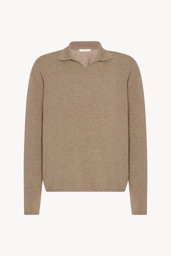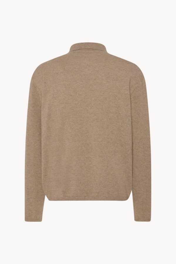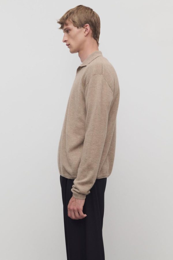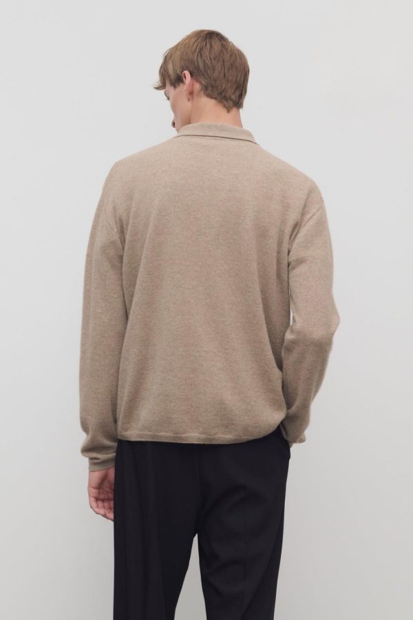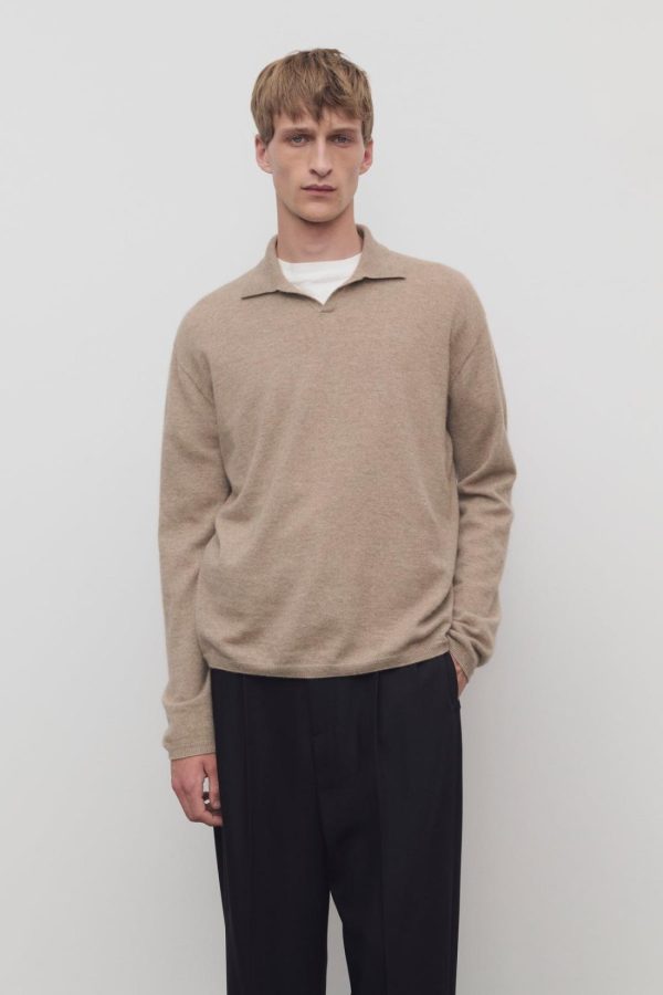 Long-sleeved polo top in soft cashmere with relaxed fit, buttonless front tab, and ribbed collar, cuffs, and hem.