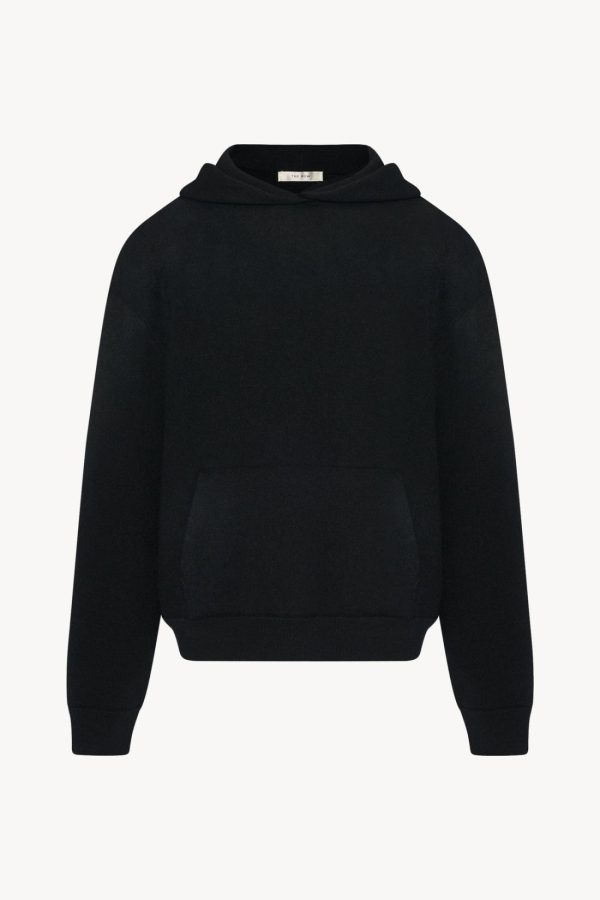 Relaxed hooded sweater in ultrafine cashmere with looped terry interior, front pouch pocket, and ribbed cuffs and hem.